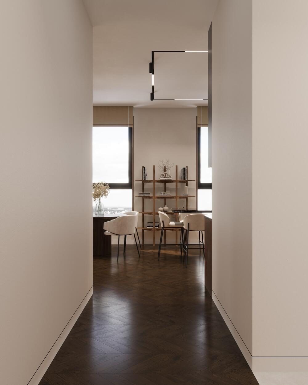 Коридор расширили, благодаря чему появилась полноценная прихожая с вместительными шкафами и местом для банкетки. Постирочную перенесли в конец коридора, рядом с технической зоной. Ещё одну комнату разделили, сделав два индивидуальных кабинета — для Алексея и Ольги, где каждый получил личное пространство для любимого дела.