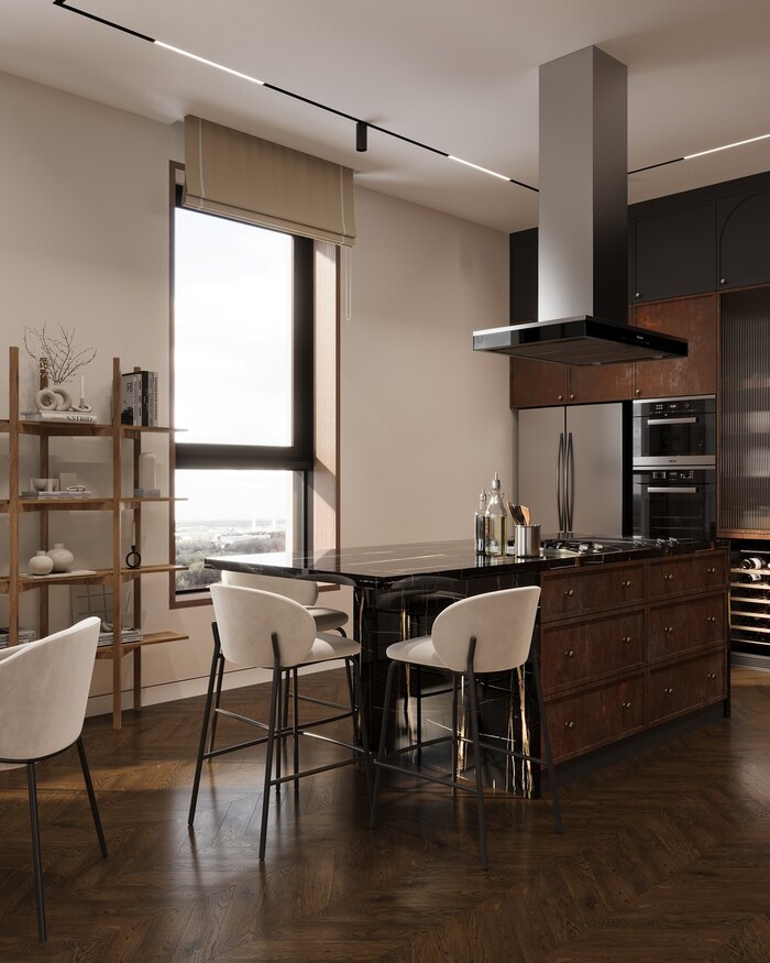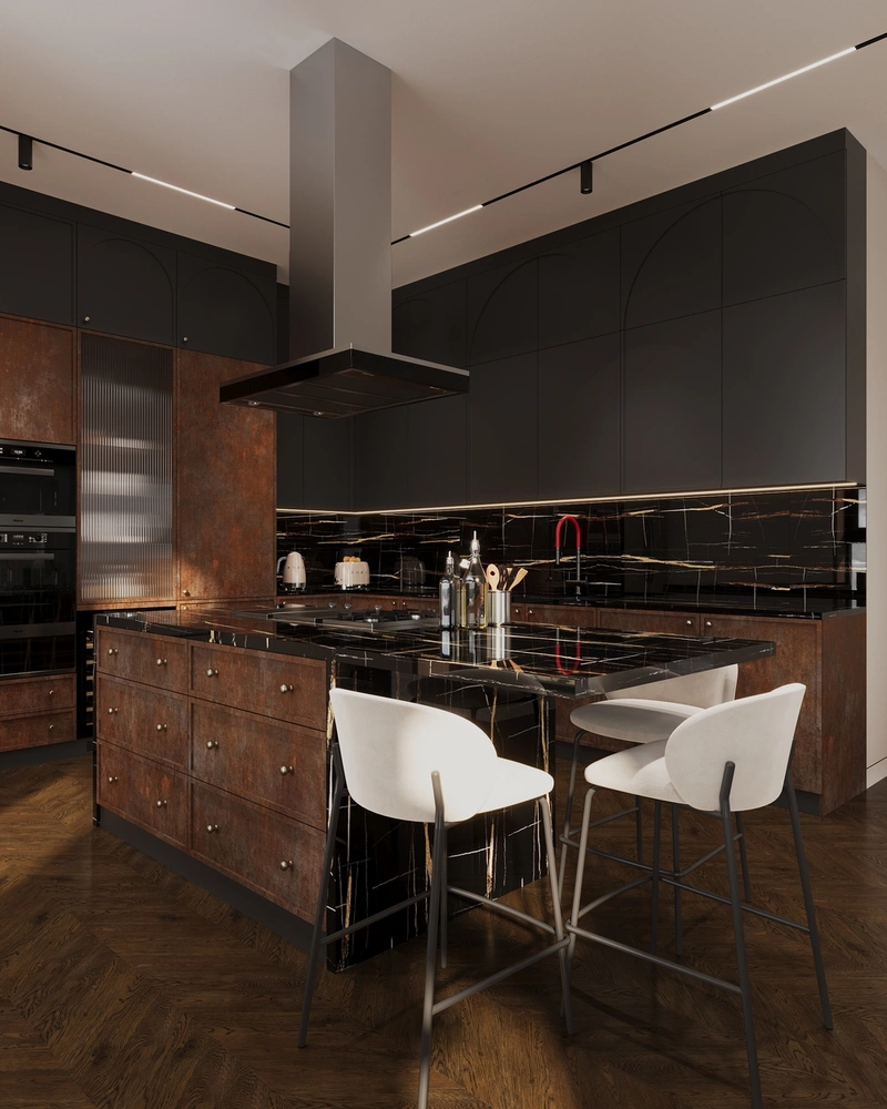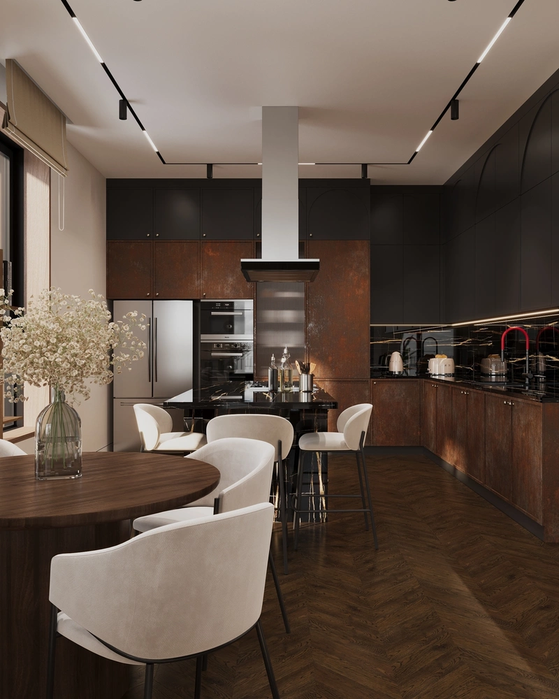 Фасады под металл с эффектом ржавчины. Контраст к светлой палитре стал важной частью композиции. Эти поверхности добавляют интерьеру брутальности и характера, подчеркивают мужскую энергию кухни и делают пространство визуально интересным.