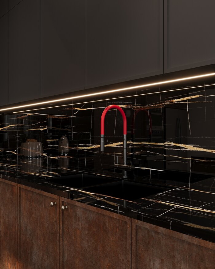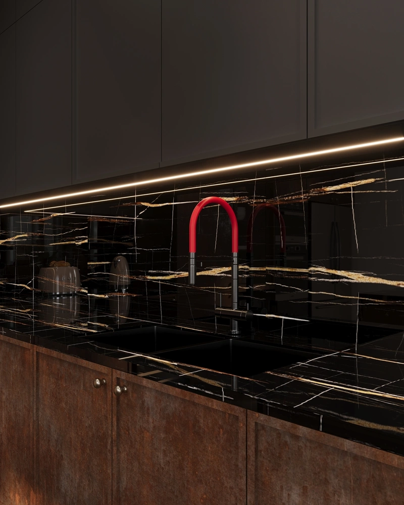 Металл — присутствует в декоративных деталях, фурнитуре и отделке фасадов кухни. Оттенки бронзы и графита добавляют интерьеру характера и контраста.