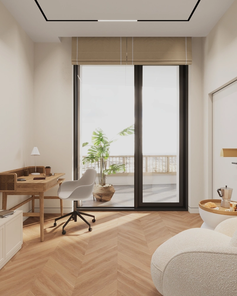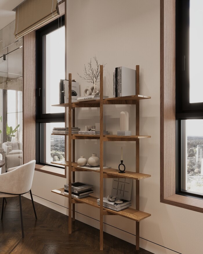 Дерево — применено в напольных покрытиях, мебели и стеновых панелях. Натуральная фактура добавляет тепла и визуальной глубины, объединяя все помещения в единое гармоничное пространство.
