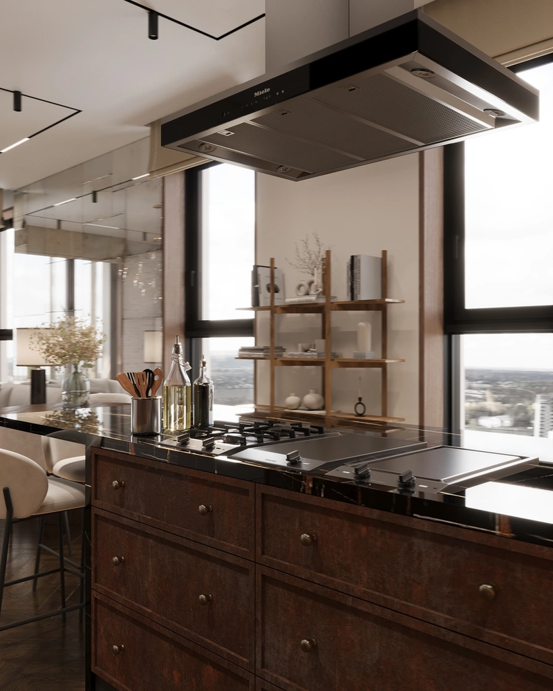 Главным пожеланием заказчиков было сделать кухню максимально функциональной, ведь заказчик увлекается кулинарией. Пространство организовано по принципу профессиональной кухни. Центральный элемент кухни — остров. Он объединяет варочную поверхность, гриль и зону для подачи блюд. Холодильник и техника встроены в высокий ряд шкафов, поддерживая чистоту линий. Винный шкаф и колонна с духовым и СВЧ-шкафами расположены в одной плоскости — всё под рукой, без визуального шума.