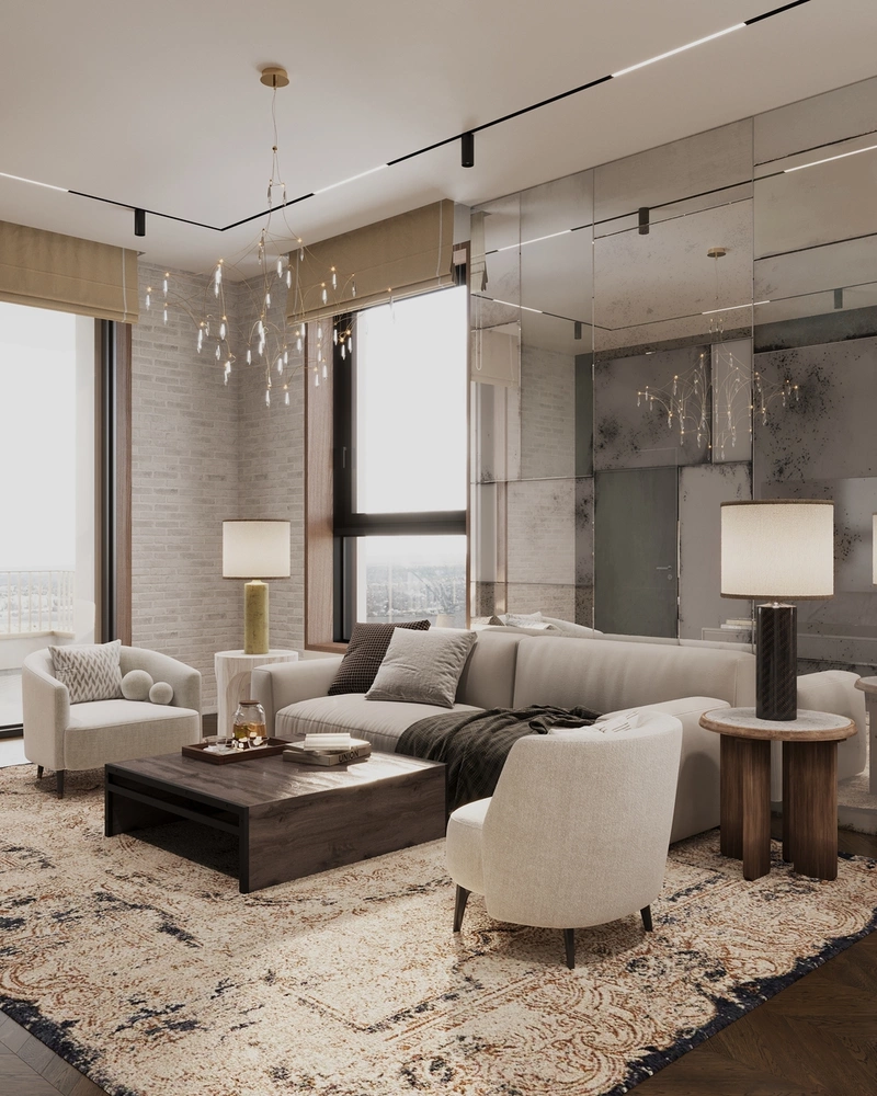 Светлая гостиная объединена с кухней, но визуально отделена мебельной группой.Композицию выстраивает большой угловой диван в мягкой обивке. Он формирует центр зоны отдыха и направлен к стене с зеркальными панелями — именно они визуально расширяют пространство и создают игру света, будто отражая город за окном. Главный акцент — барельеф на стене, выполненный из гипса по индивидуальному эскизу. Он стал эмоциональным центром интерьера и отражает вкус заказчиков к путешествиям и искусству.