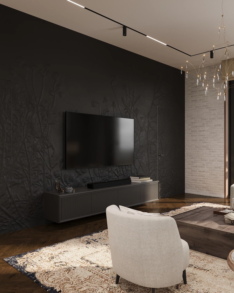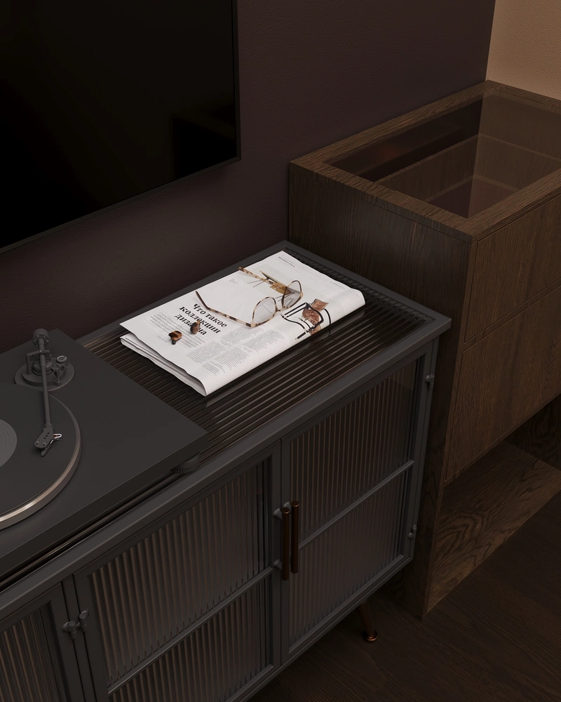 Отдельного внимания заслуживает компактная ТВ-зона с виниловым проигрывателем и системой хранения. Здесь можно поставить пластинку, включить музыку и переключиться после насыщенного дня.