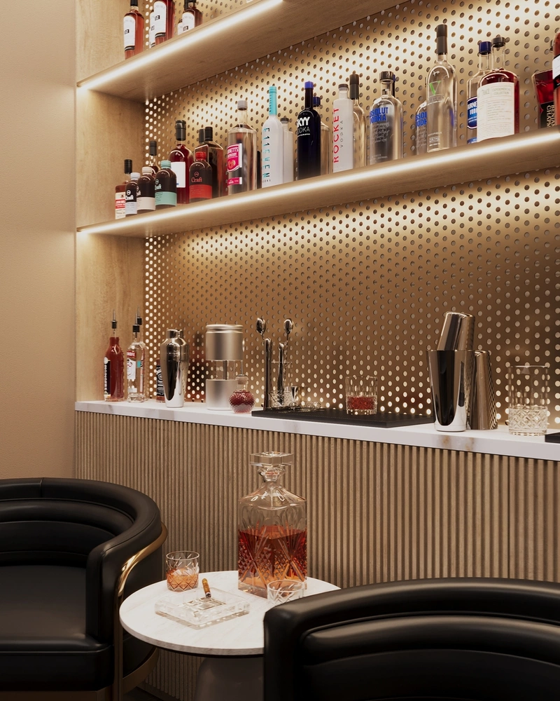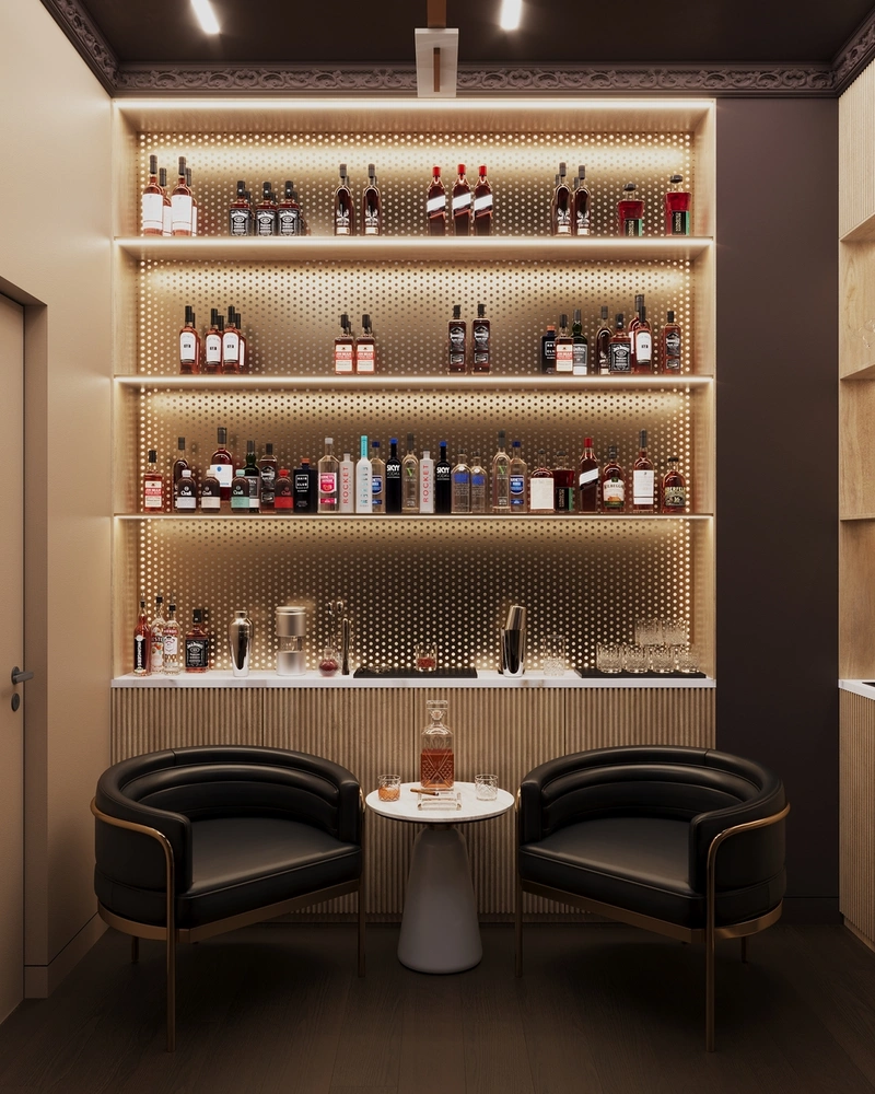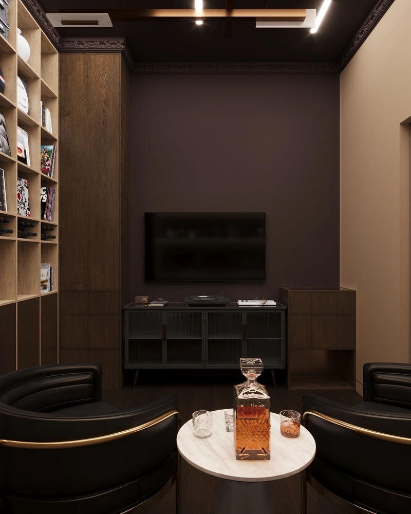 Главная идея — соединить функциональность рабочего кабинета и атмосферу приватного лаунжа. Для этого помещение поделено на две зоны: рабочее место и барную часть. Вдоль одной стены расположена встроенная библиотека и система хранения коллекции виски, а у другой — зона дегустации с креслами и журнальным столиком.