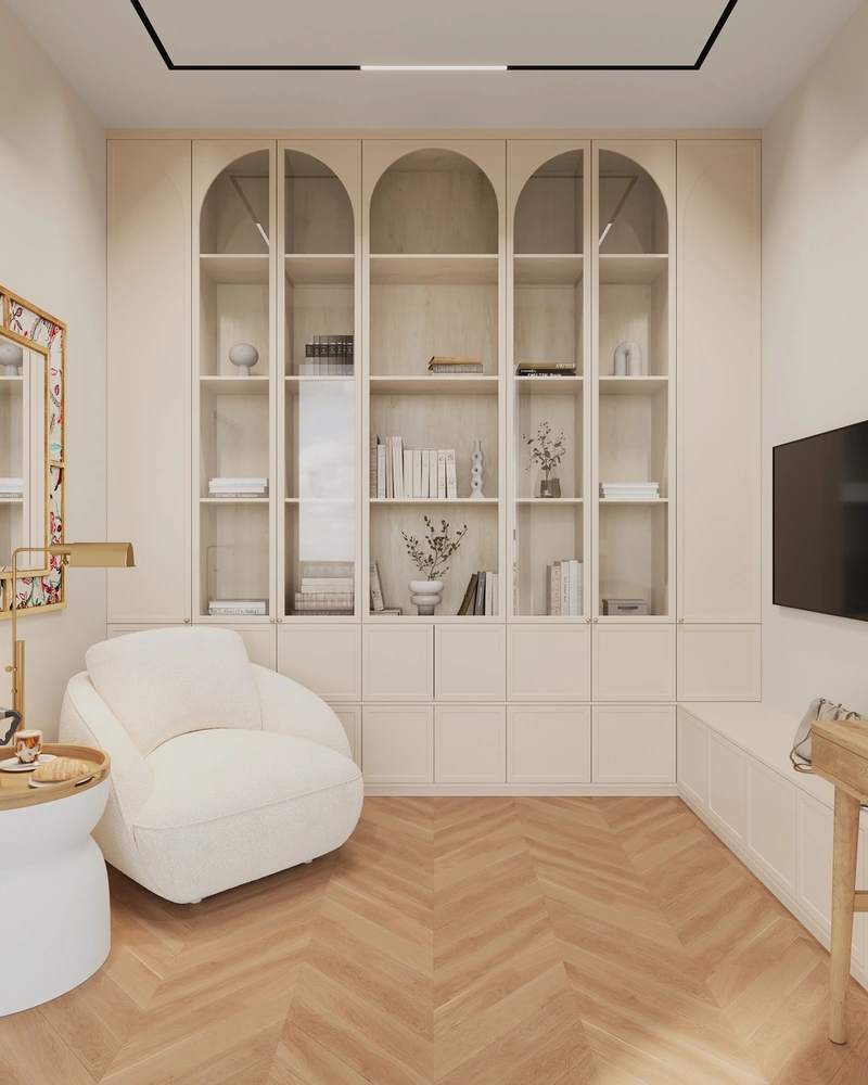 На противоположной стене разместили встроенную библиотеку со стеклянными арочными фасадами — она визуально вытягивает комнату вверх, добавляет архитектурности. Нижние секции закрытые — там хранится всё, что не должно быть на виду: материалы, документы, аксессуары для хобби.