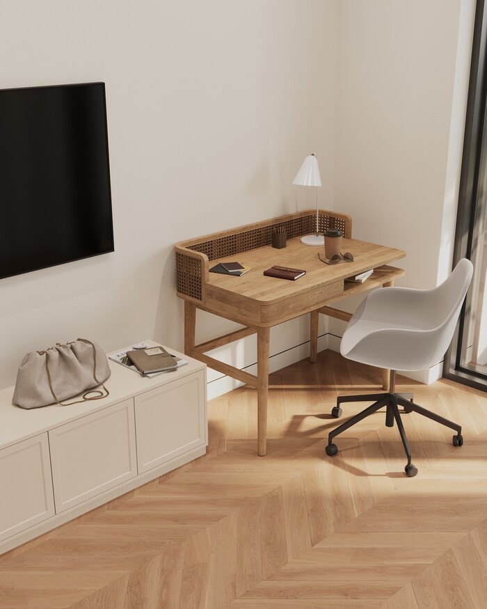 Главная задача была объединить функциональность и ощущение уединения. На этапе проектирования мы предусмотрели большое рабочее место у окна, чтобы дневной свет равномерно освещал стол, не создавая бликов. Такое расположение удобно для любой ручной работы: вышивки, эскизов, чтения.
