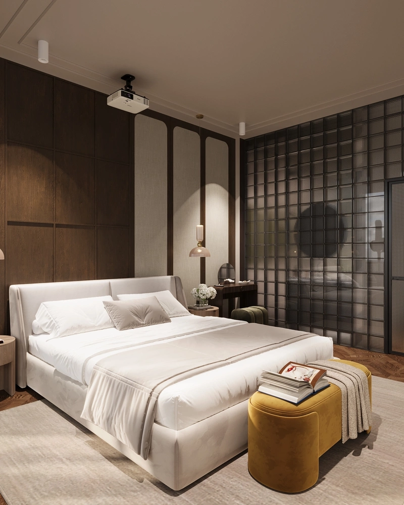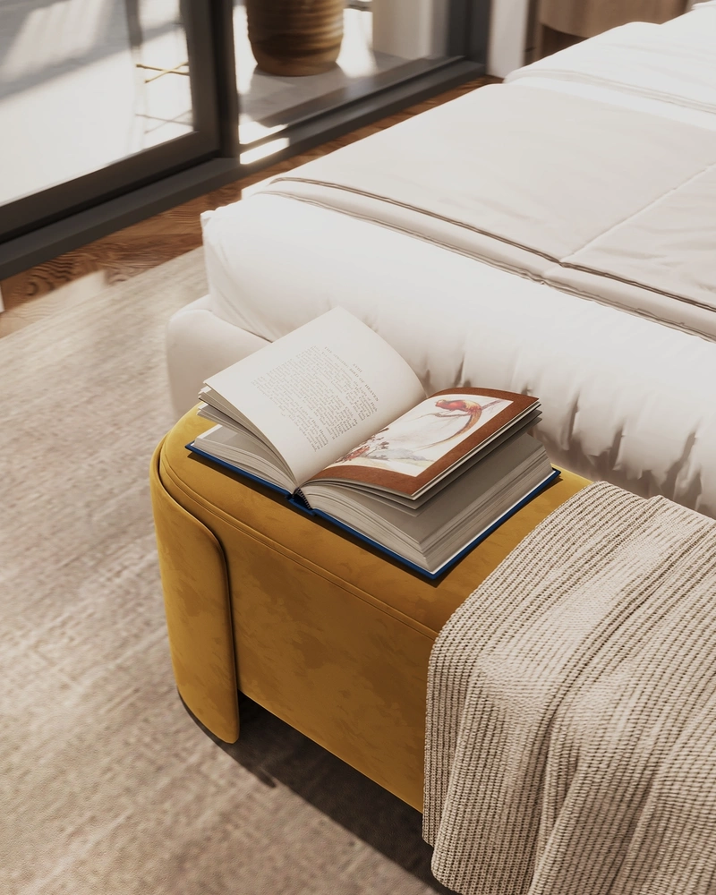 В изножье — банкетка насыщенного горчичного оттенка. Она добавляет акцент цвета и выполняет сразу несколько функций: на неё удобно класть одежду, сидеть, надевать обувь или использовать как дополнительное место хранения.