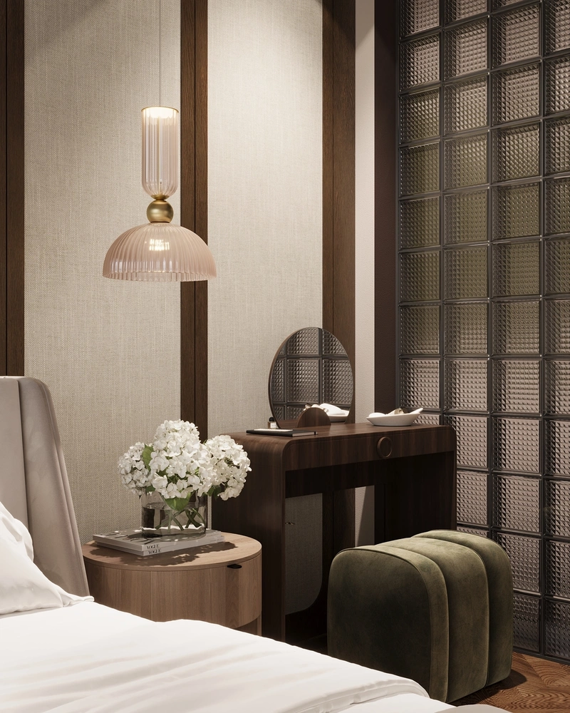 Особый приём — стеклоблочная стена между спальней и ванной. Через неё мягко проходит дневной свет. При этом стеклоблоки сохраняют приватность — важно, когда ванная примыкает к спальне.