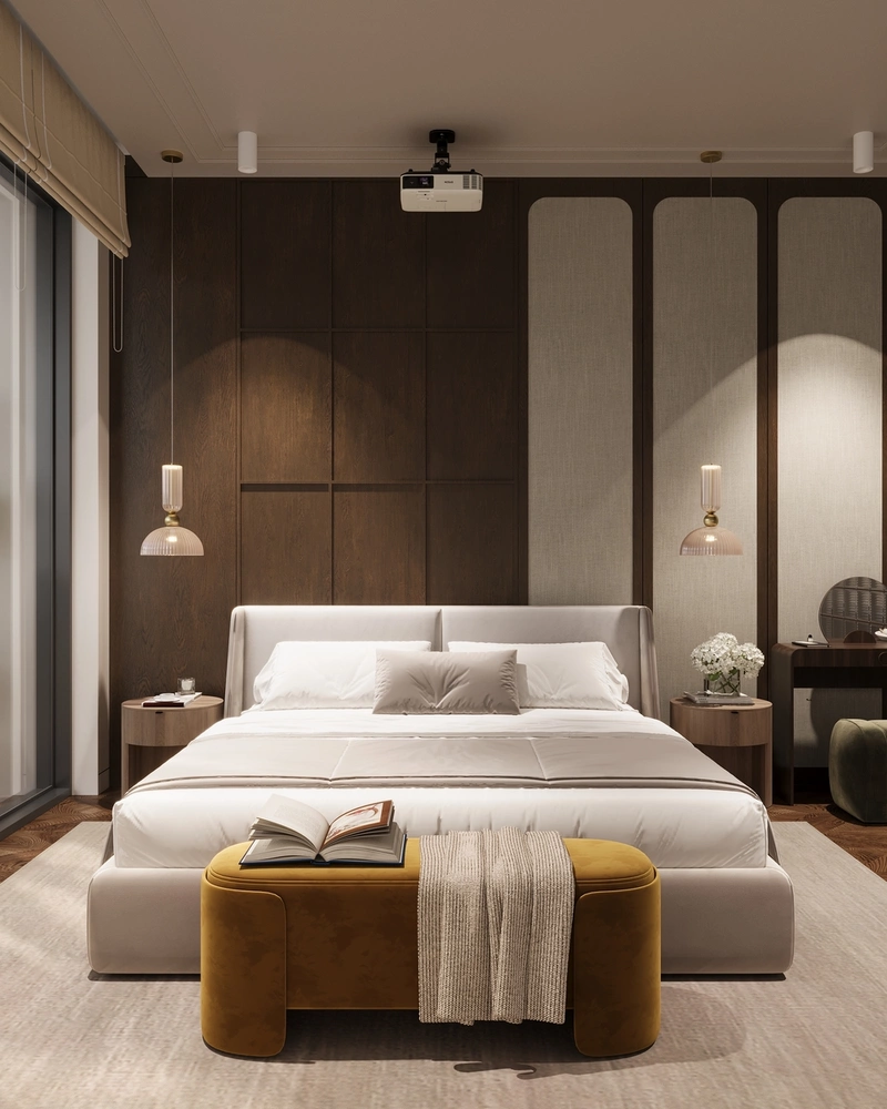 В этой спальне всё продумано до мелочей, чтобы пространство было не только красивым, но и удобным для ежедневного использования.