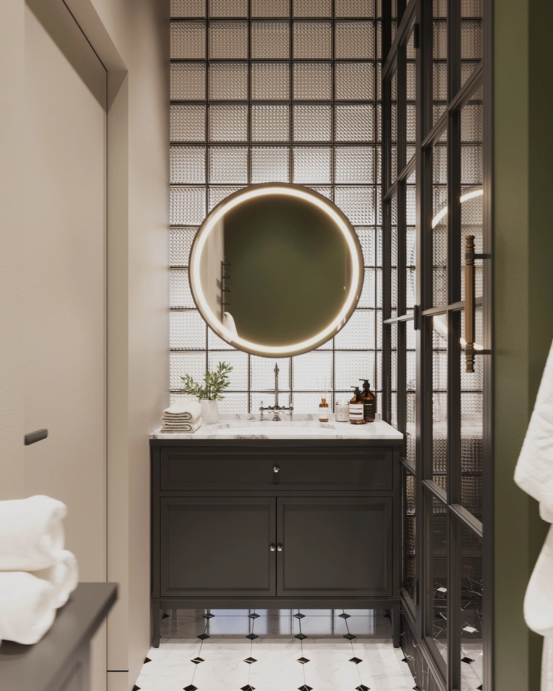Благодаря грамотной планировке и стене из стеклоблоков ванная стала естественным продолжением спальни. Она выглядит просторнее, наполняется мягким светом и создаёт ощущение спокойствия — именно такого, каким должно быть утро в собственном доме.