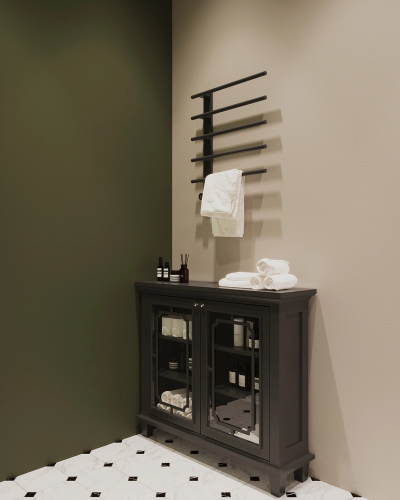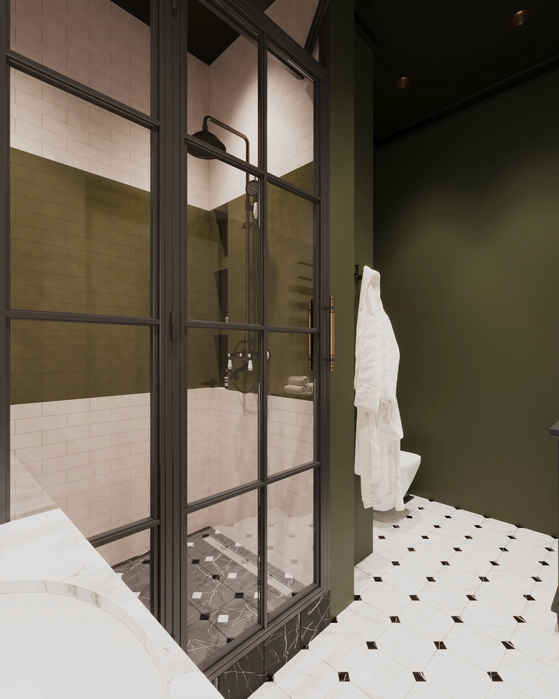 Для отделки использован керамогранит под мрамор в сочетании с матовыми поверхностями глубокого зелёного оттенка. Встроенные ниши в душевой позволяют хранить косметику без визуального шума. Планировка обеспечивает удобство в использовании — все элементы на оптимальной высоте и в зоне лёгкой досягаемости.