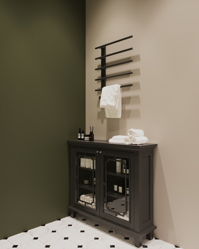 Отделка выдержана в природных оттенках: плитка цвета хаки сочетается с тёплым светлым керамогранитом под мрамор. Матовые поверхности отражают свет мягко, без бликов — в них приятно находиться утром и вечером.