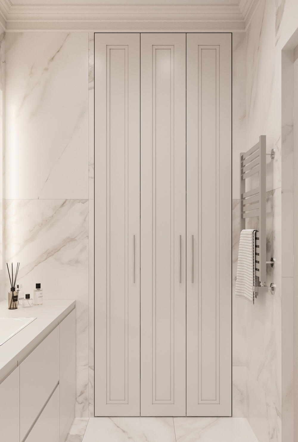 Основной задачей было разместить постирочную зону, не теряя ни сантиметра полезного пространства. Для этого мы использовали кусочек площади кухни, примыкающий к ванной, и сделали встроенный хозшкаф с доступом прямо из ванной комнаты. В нём спрятаны стиральная и сушильная машины, полки для бытовой химии и корзины для белья — всё аккуратно и под рукой.