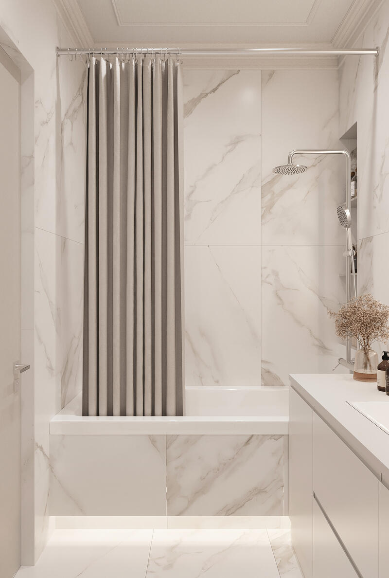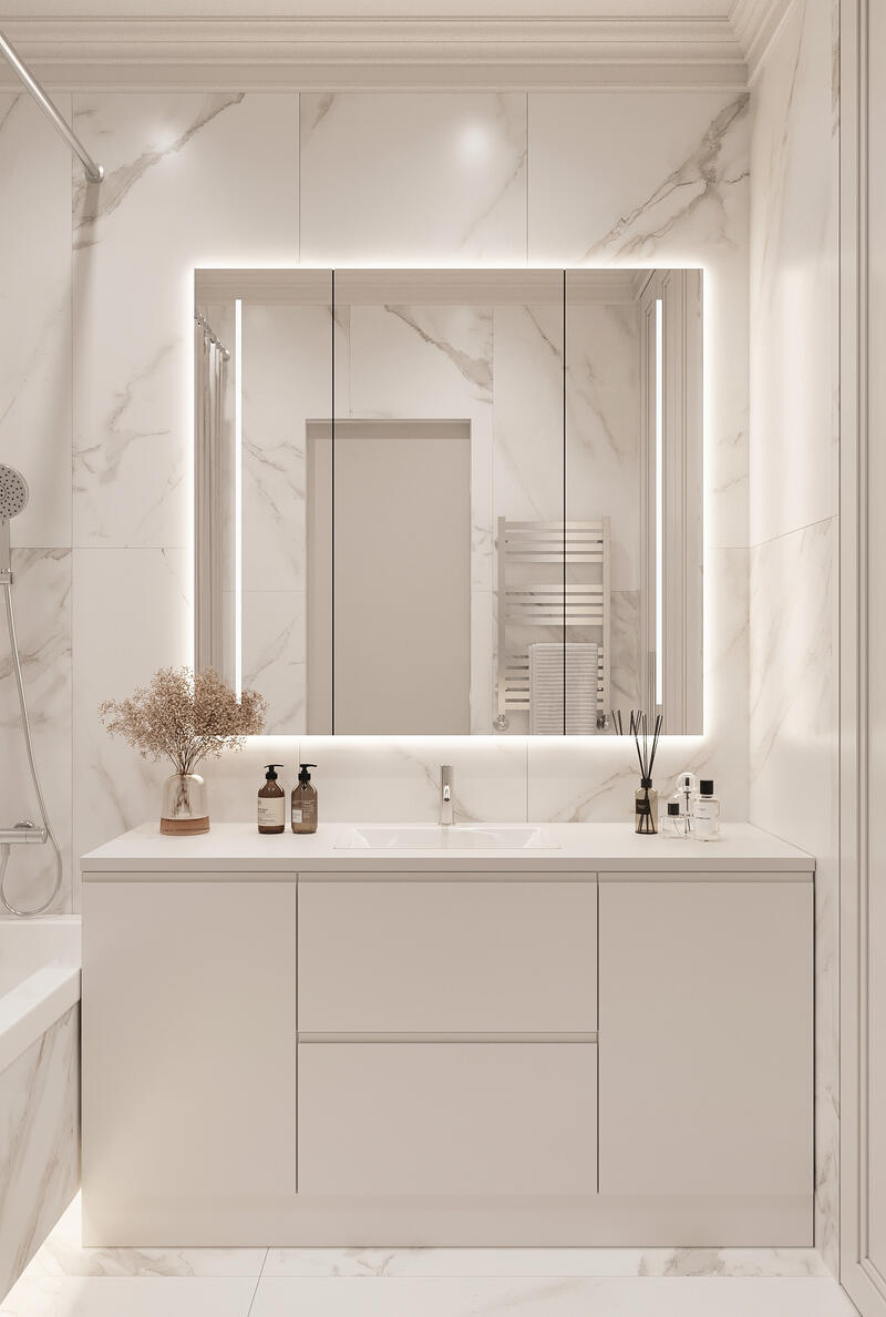 Отделка выдержана в светлых, естественных оттенках. На стенах — крупноформатный керамогранит под мрамор, который визуально расширяет пространство. Тёплый свет и лаконичные формы создают ощущение спа-зоны. Все поверхности практичны и легко моются, что особенно важно для ежедневного использования.