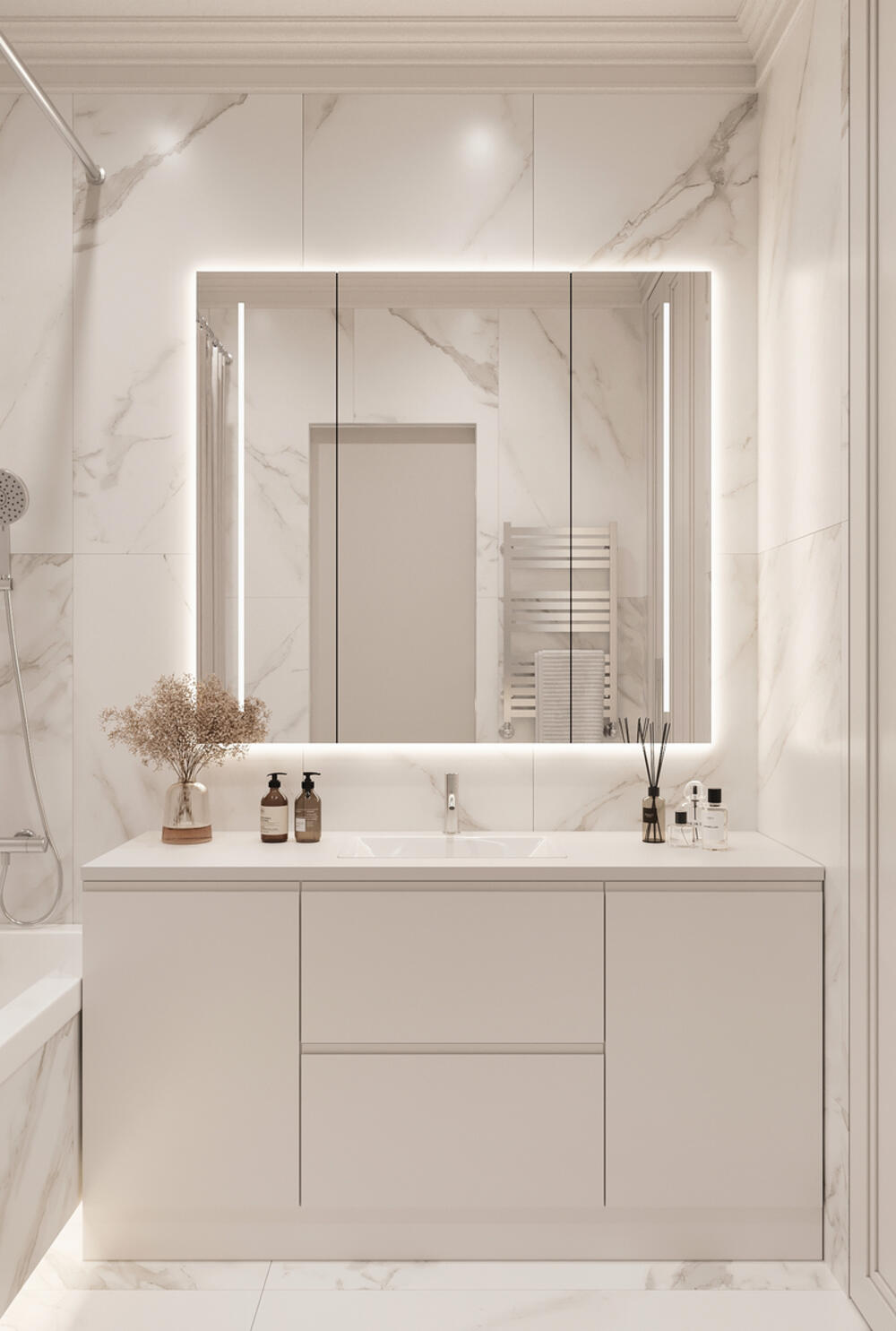 Керамогранит крупного формата под мрамор — применён в прихожей, кухне и ванной. Он не только визуально расширяет пространство, но и удобен в уходе: устойчив к влаге, царапинам и перепадам температуры.