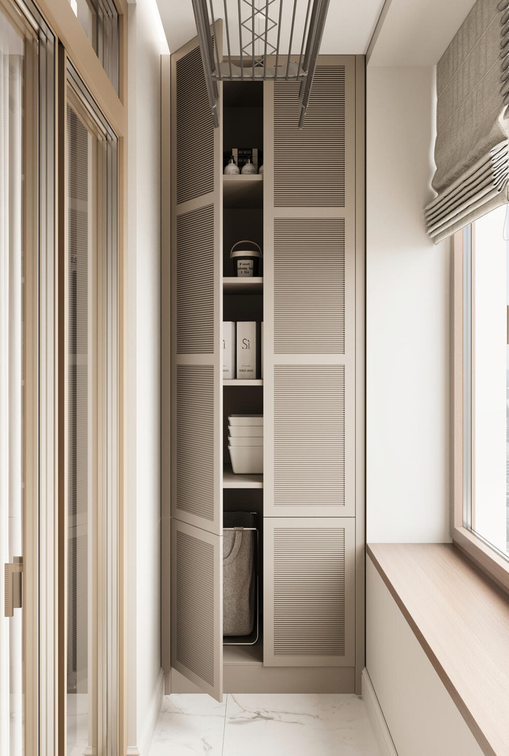 Дополнительно организовали встроенный шкаф с полками для хранения хозяйственных мелочей: бытовой химии, коробок, корзин для белья. За счёт лаконичного дизайна фасадов балкон не выглядит утилитарным, а гармонично продолжает стиль квартиры.