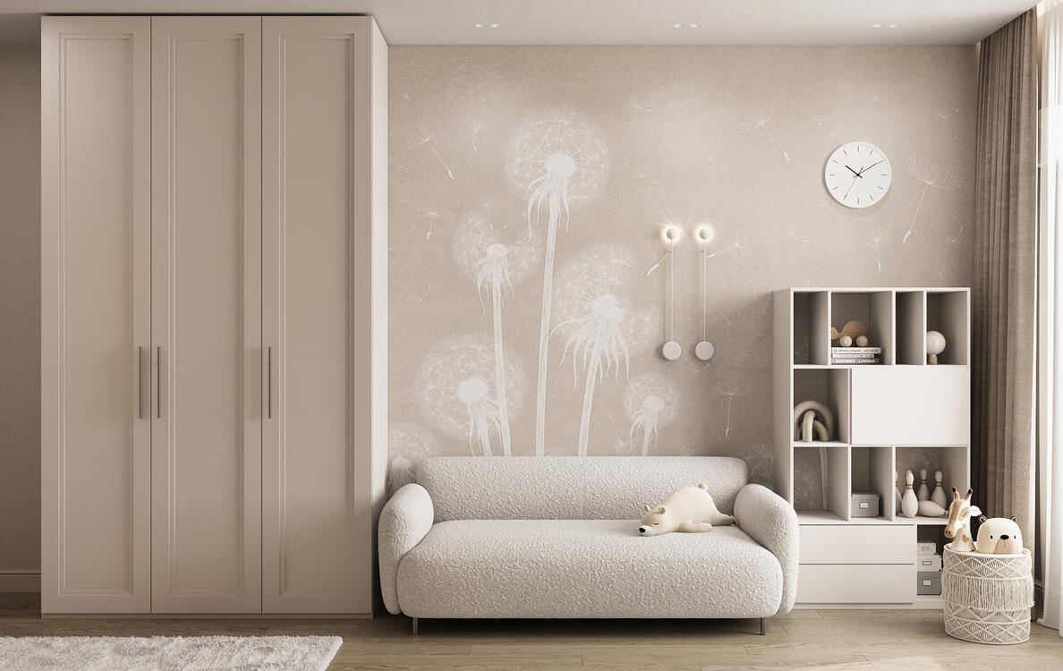 Стены оформлены в мягких бежевых тонах с акцентом в виде нежного рисунка одуванчиков — он добавляет лёгкости и создаёт настроение мечтательности, при этом подходит и для кабинета, и для детской. Встроенный шкаф вместительный, но благодаря светлым фасадам не перетягивает на себя внимание.