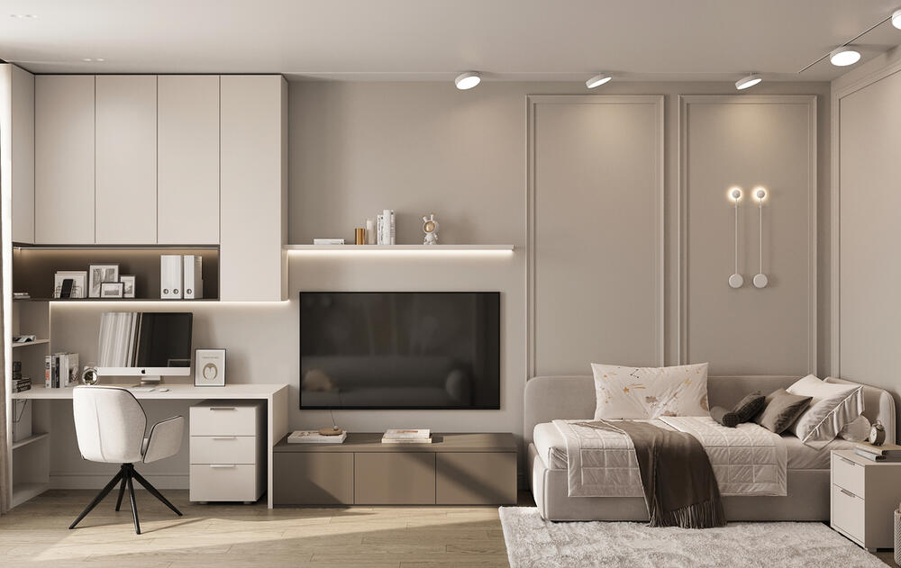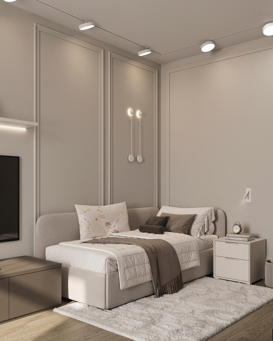 Монохромная палитра, выразительные фактуры и мягкое освещение формируют ощущение лёгкости и спокойствия. Каждый метр работает на удобство, а каждый элемент — на визуальную гармонию.