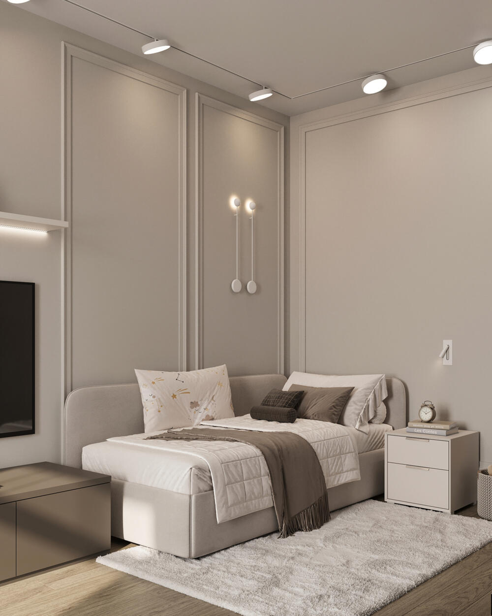 Освещение — многоуровневое: верхний свет, бра у кровати и точечная подсветка, чтобы можно было легко менять сценарии — от мягкого вечернего до рабочего.