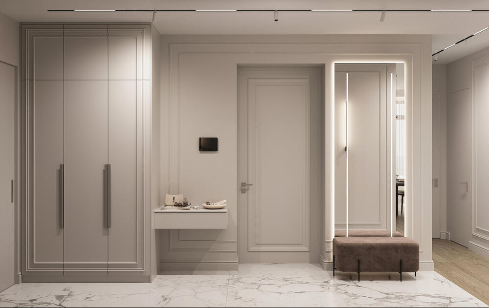Большое зеркало с подсветкой расширяет пространство и даёт возможность быстро проверить образ перед выходом. Рядом расположена консоль для ключей и мелочей — удобная деталь, которая экономит время в повседневной жизни.
