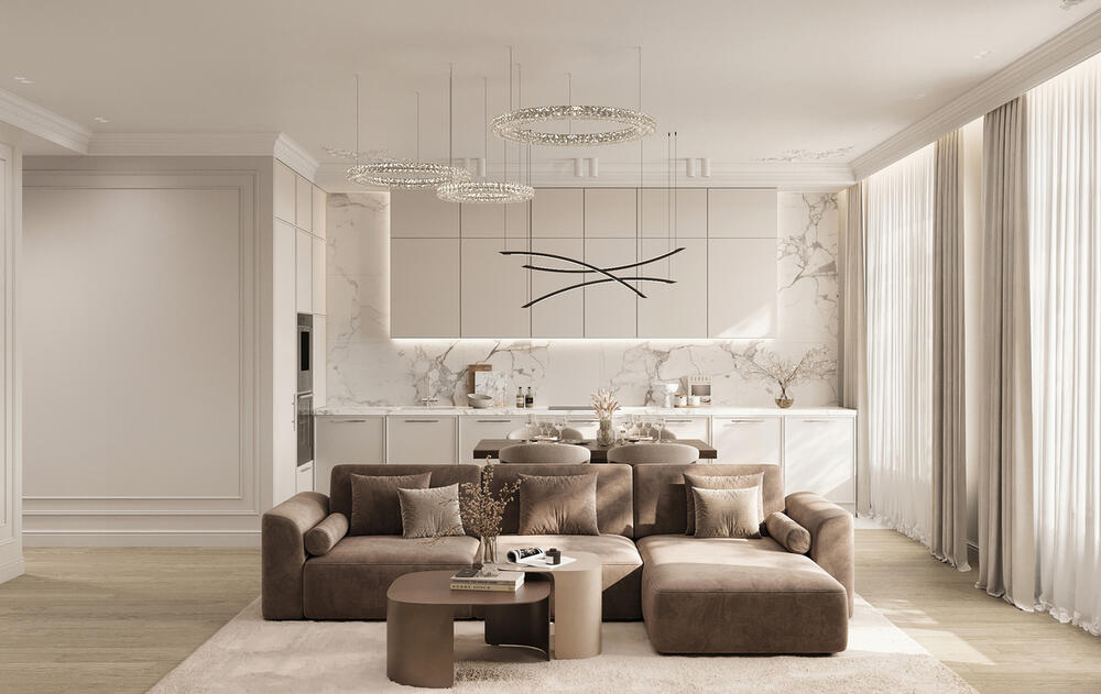 Интерьер в стиле современная классика в бежевых оттенках без ярких акцентов