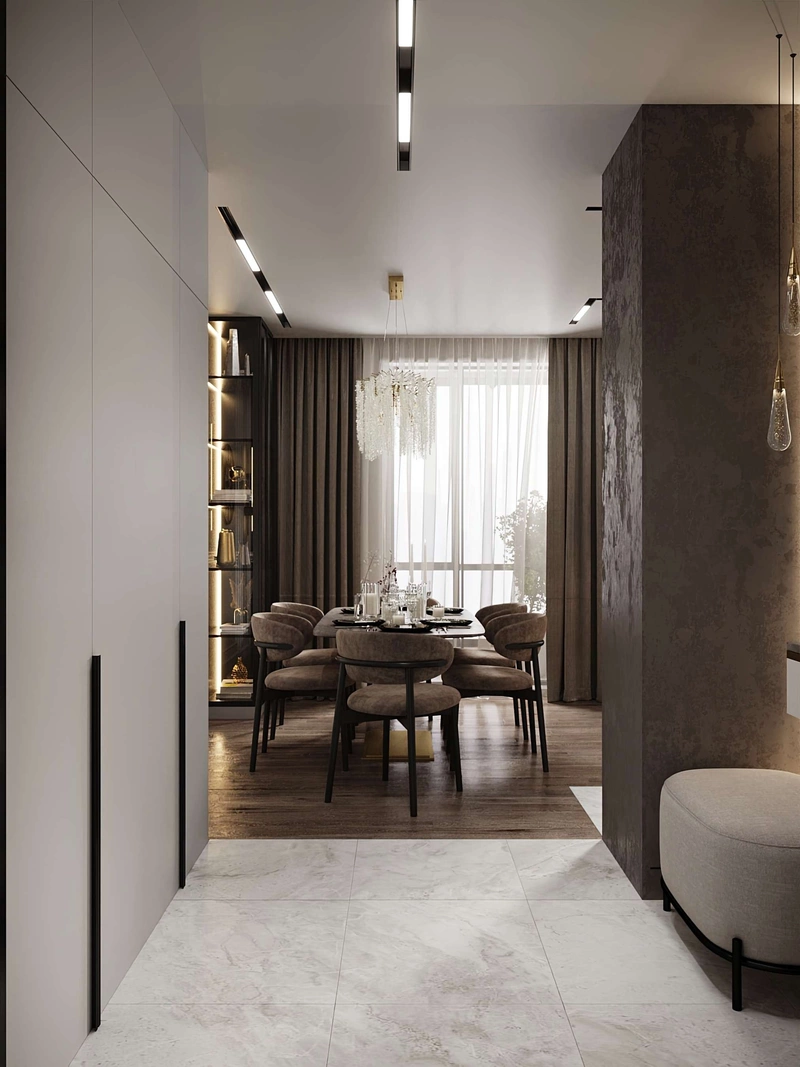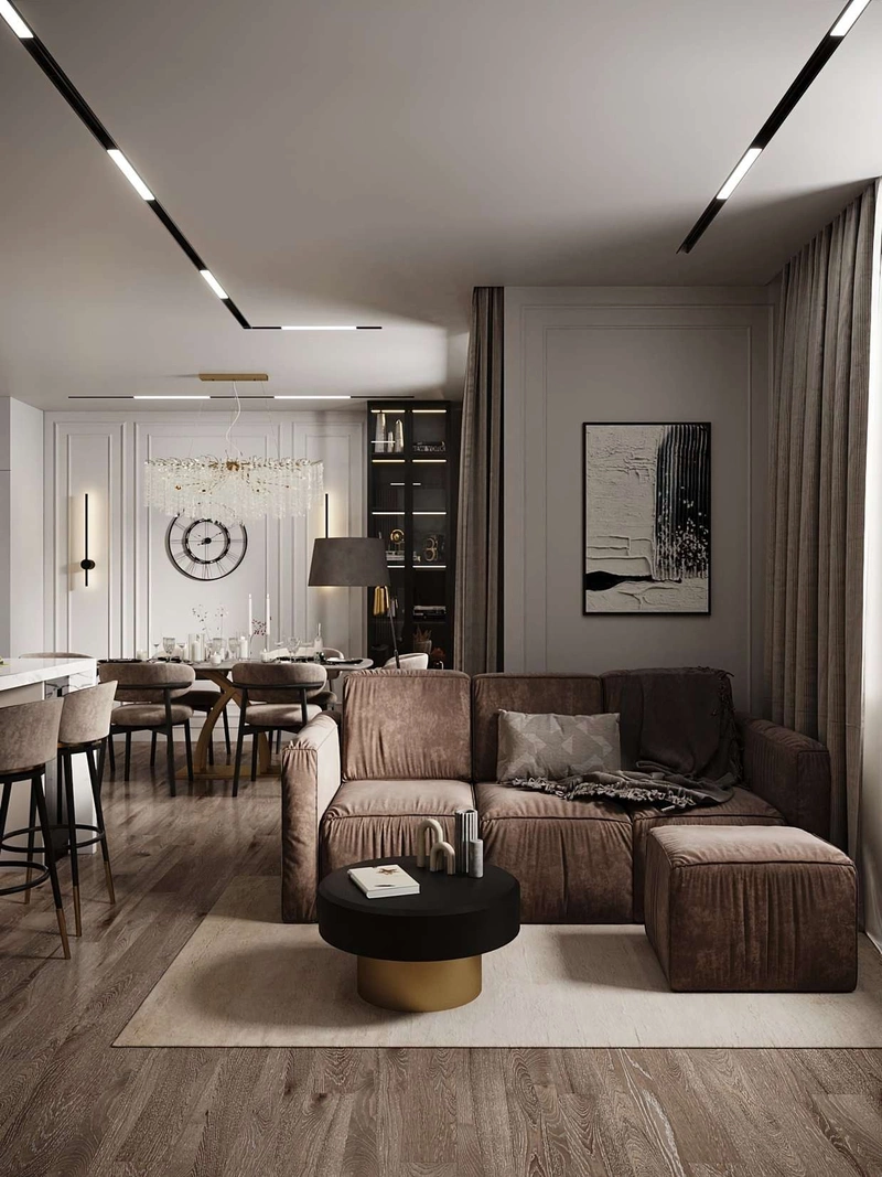 Гармоничная кофейная палитра с акцентами графита и золота, использование натуральных материалов, скрытых систем и элегантного декора сделали интерьер стильным, комфортным и продуманным до мелочей.