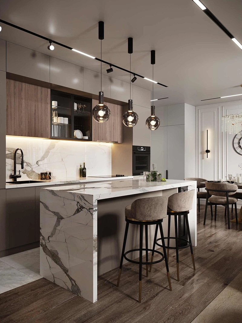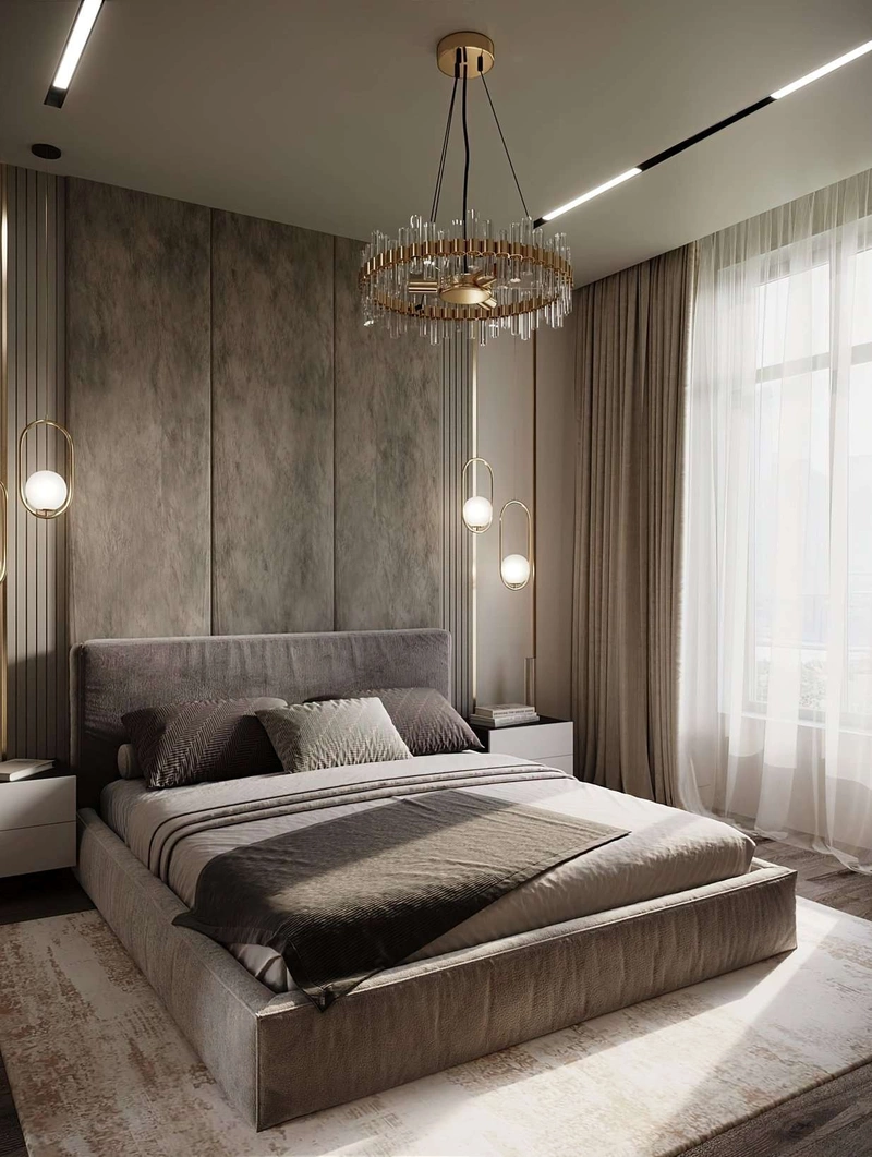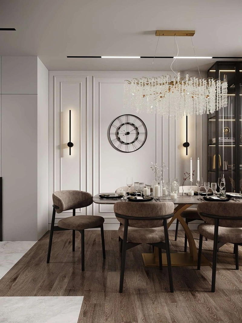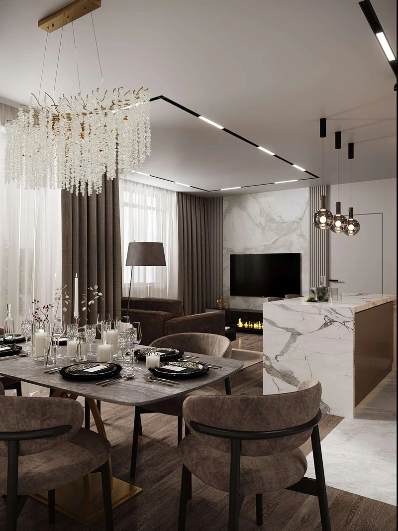 - Металлические акценты (золото, латунь) в освещении и декоре.