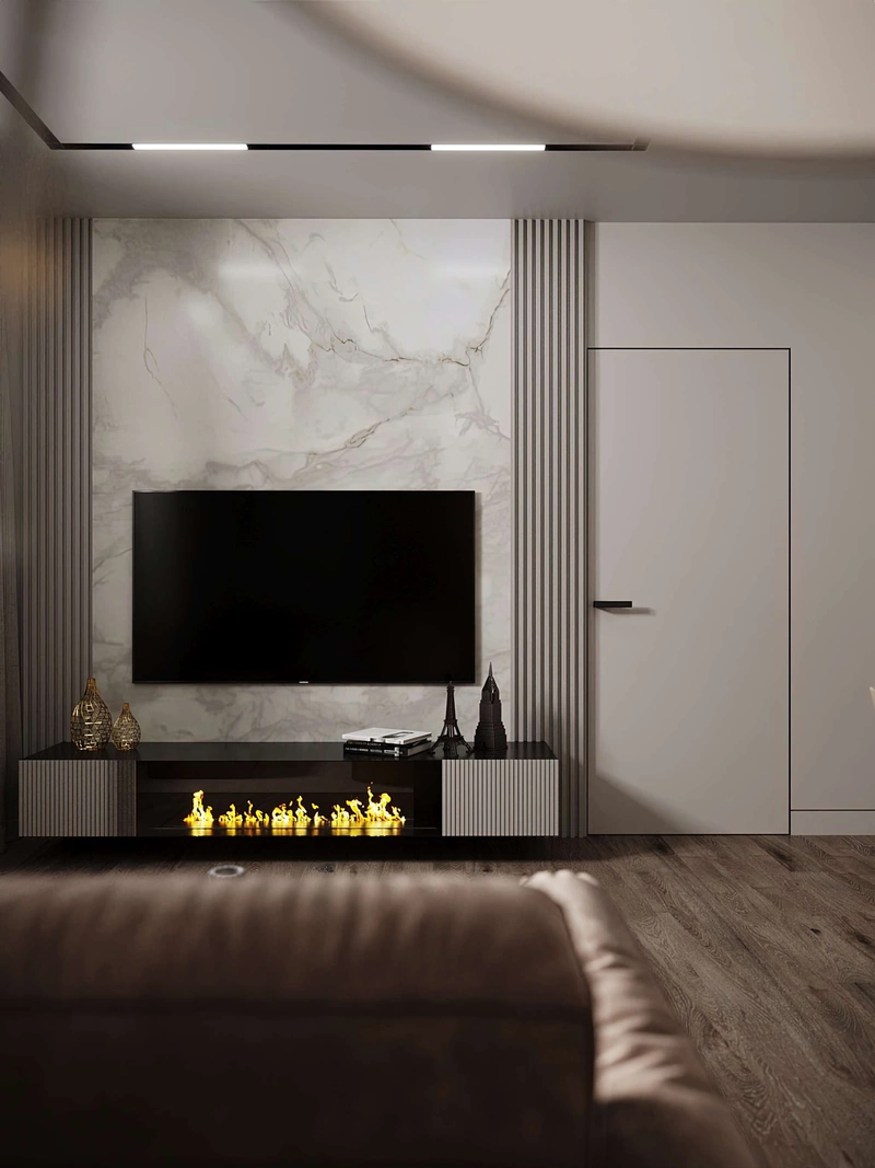 - Премиальная отделка гостиной – молдинги, реечные панели и продуманная мебельная композиция делают пространство визуально дорогим и элегантным.