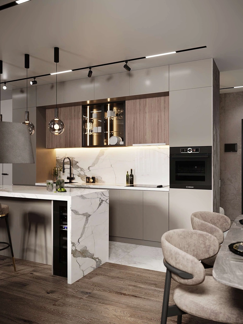 Кухня выполнена в современной классике с линейной планировкой и центральным островом.
