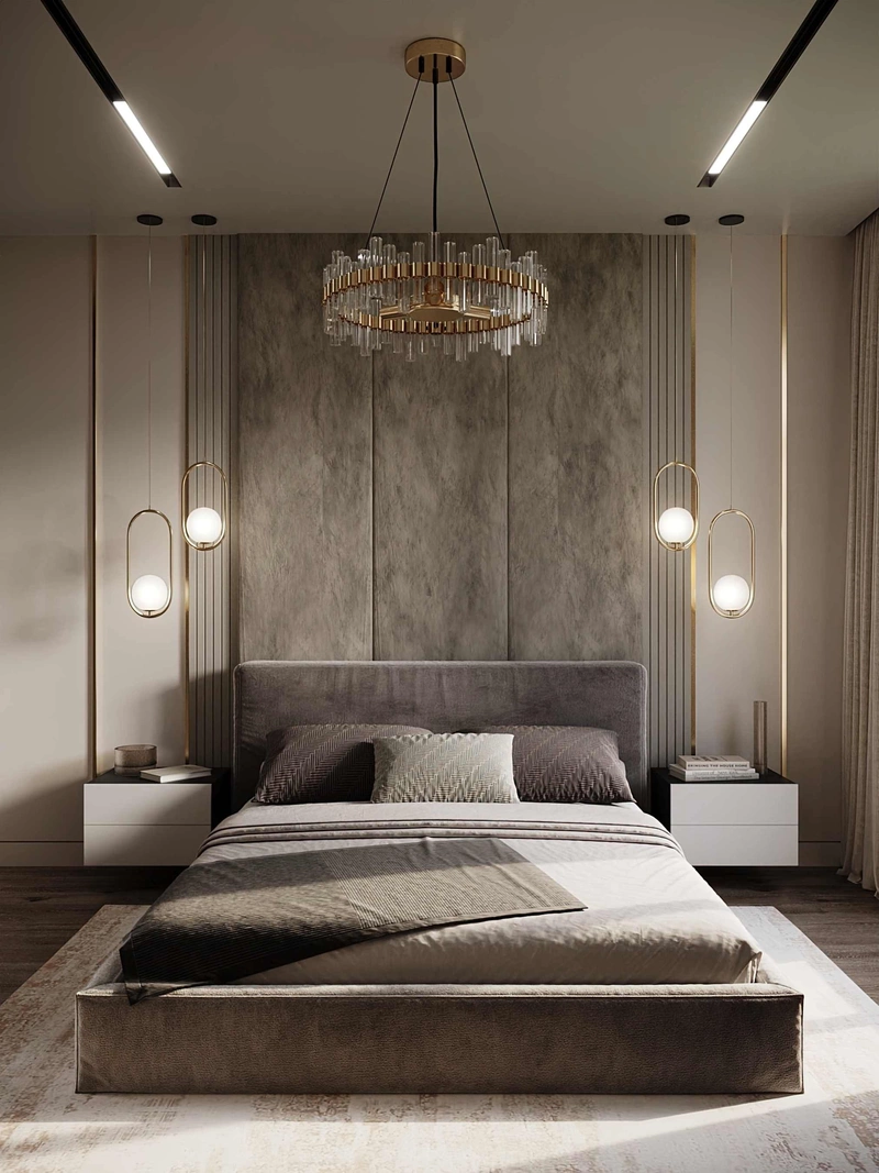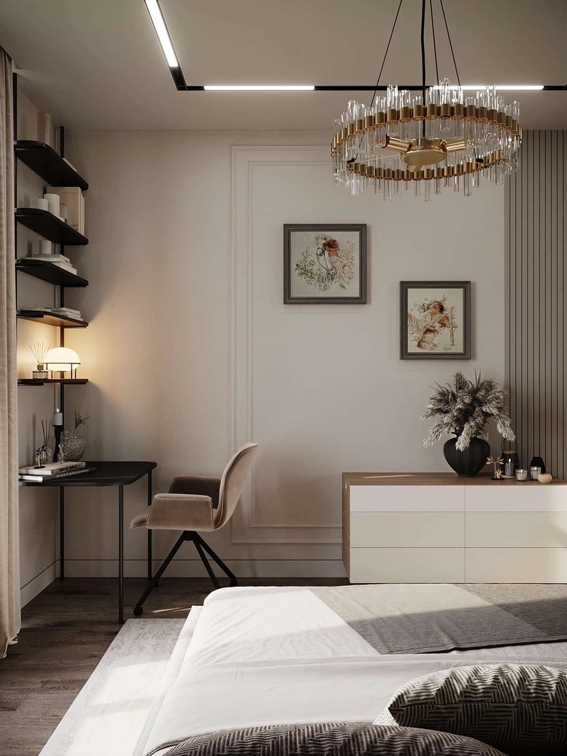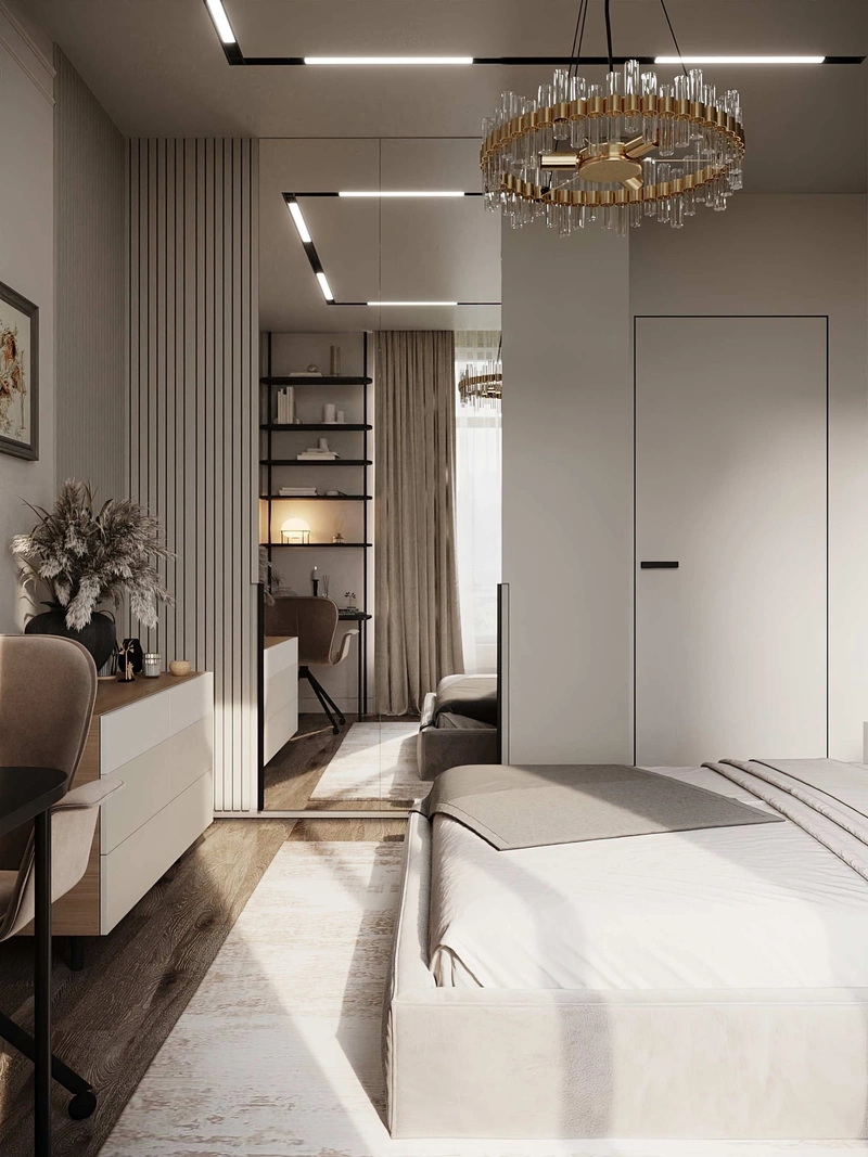 Центральным элементом стало мягкое текстильное изголовье кровати, которое визуально выделяет спальную зону. Стена за кроватью оформлена декоративными панелями с фактурным покрытием и тонкими вертикальными молдингами. Подвесные светильники с металлическими акцентами создают мягкое зонированное освещение, заменяя классические настольные лампы. Благодаря этому прикроватные тумбы остаются свободными для хранения. Функциональность спальни дополняет система хранения с закрытыми фасадами, которая визуально остается незаметной.