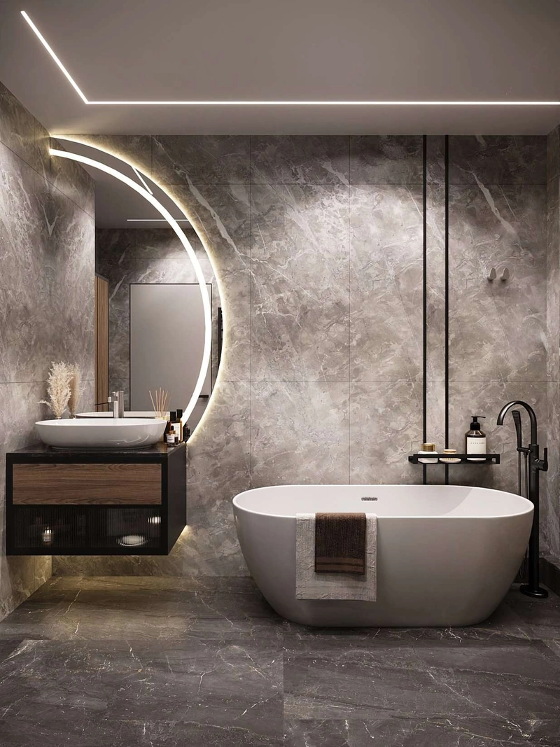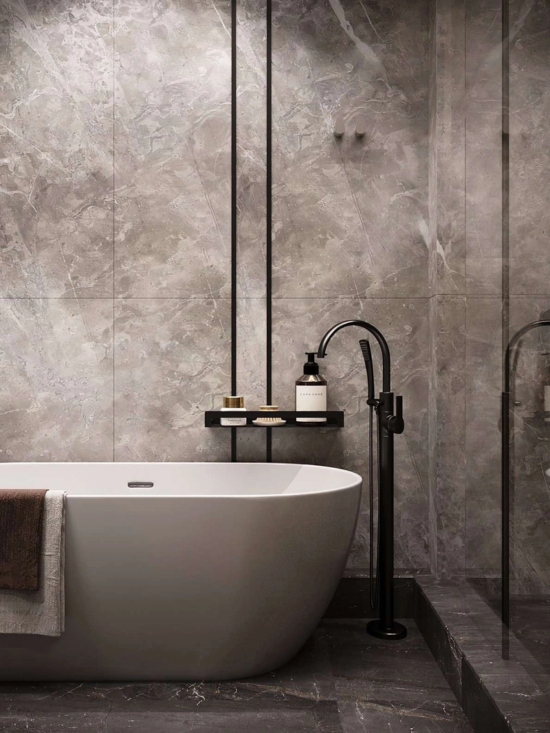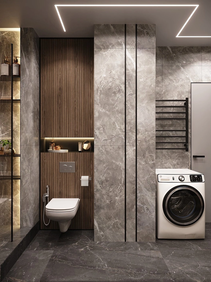 Санузел оформлен в современном стиле с элементами классики, сочетая натуральные материалы и лаконичные формы. Заказчики хотели разместить отдельно стоящую ванну и душевую зону, поэтому было принято решение объединить два санузла в одно просторное помещение. Стены и пол отделаны керамогранитом с имитацией натурального камня, который не только визуально расширяет пространство, но и практичен в уходе. Акцентная зона за унитазом оформлена деревянными реечными панелями, добавляя интерьеру тепла и текстурного разнообразия.