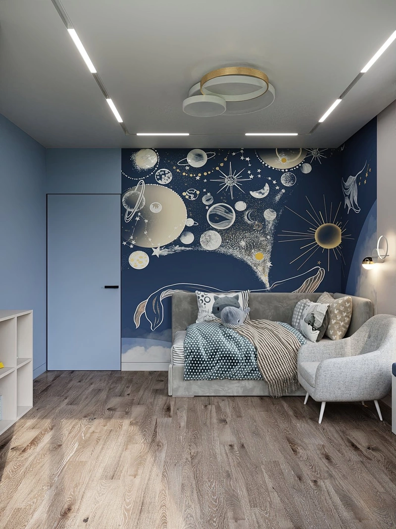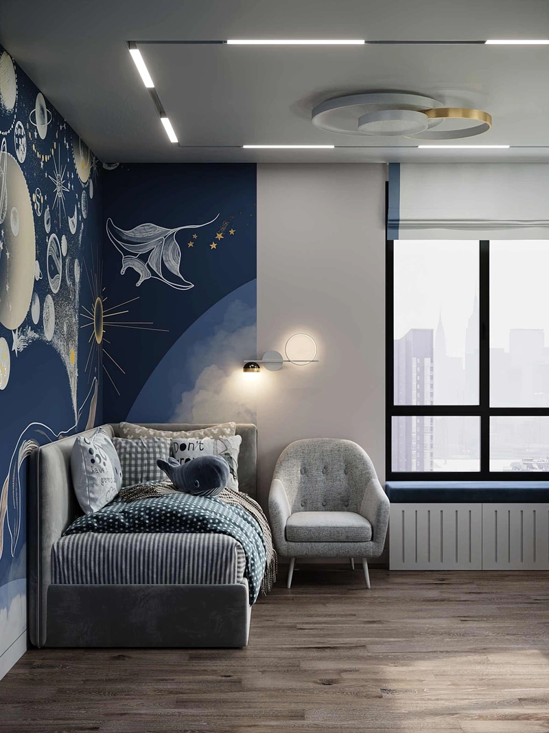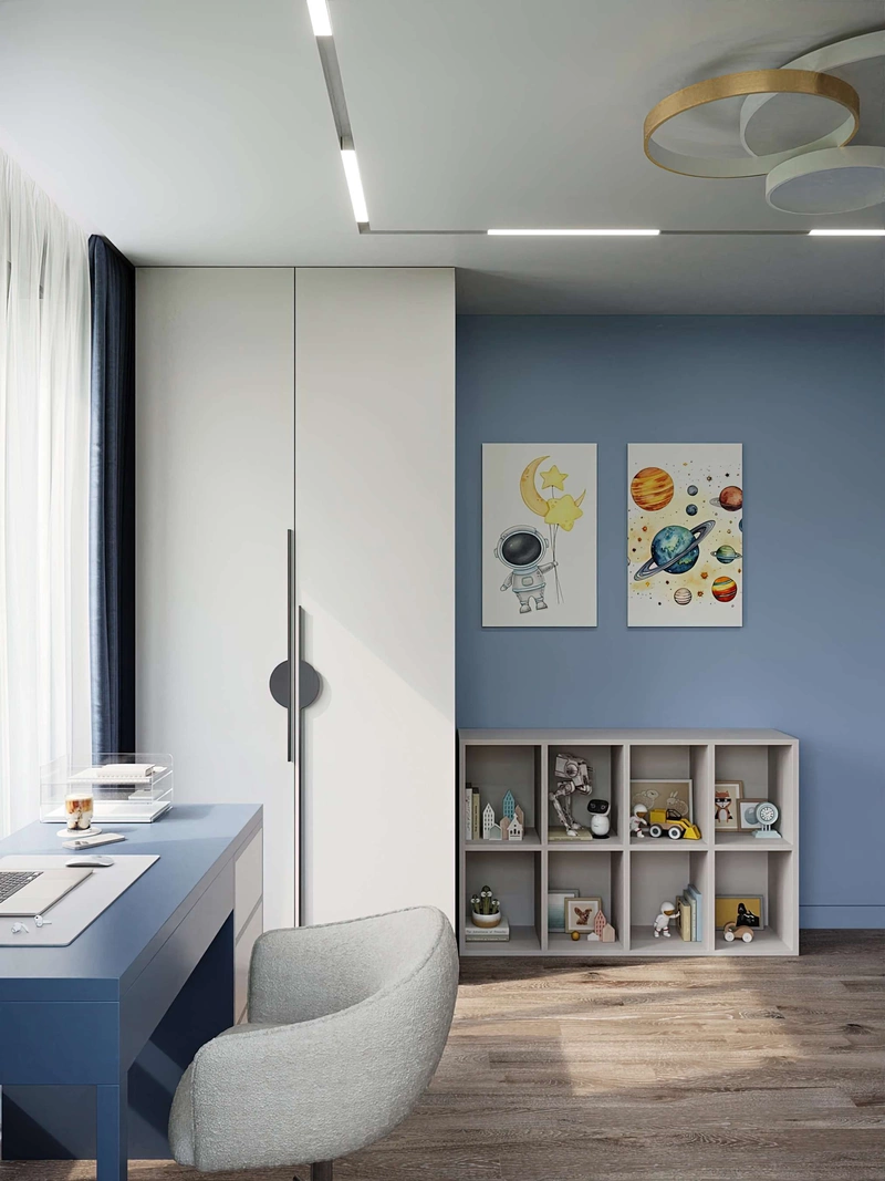 В отделке использованы приглушенные серо-синие оттенки, которое создает спокойную атмосферу, и не перегружает пространство лишними акцентами. Это универсальное решение, которое легко адаптируется под изменяющиеся интересы ребенка.