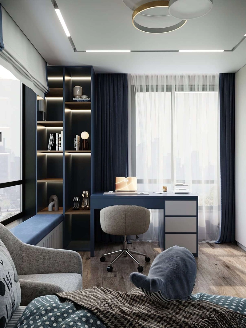Детская комната создана с учетом возрастных потребностей ребенка и возможностью трансформации по мере его взросления. Основной задачей было организовать функциональное и комфортное пространство, которое объединяет игровую, учебную и спальную зоны. Рабочая зона расположена у окна, что обеспечивает естественное освещение в течение дня. Компактный письменный стол с удобным креслом и встроенные стеллажи с подсветкой создают удобное место для учебы и хранения книг. Спальное место оформлено текстильным изголовьем, которое делает зону сна уютной и защищенной. Система хранения представлена встроенными шкафами и открытыми полками, где удобно размещаются игрушки, книги и личные вещи ребенка.