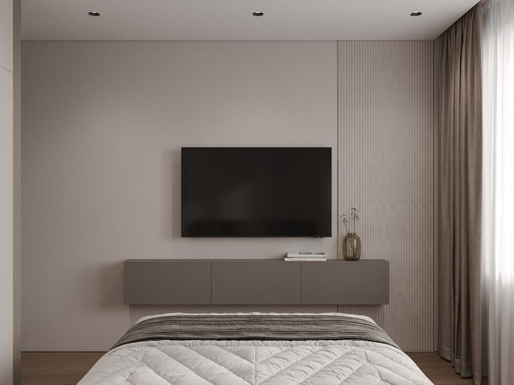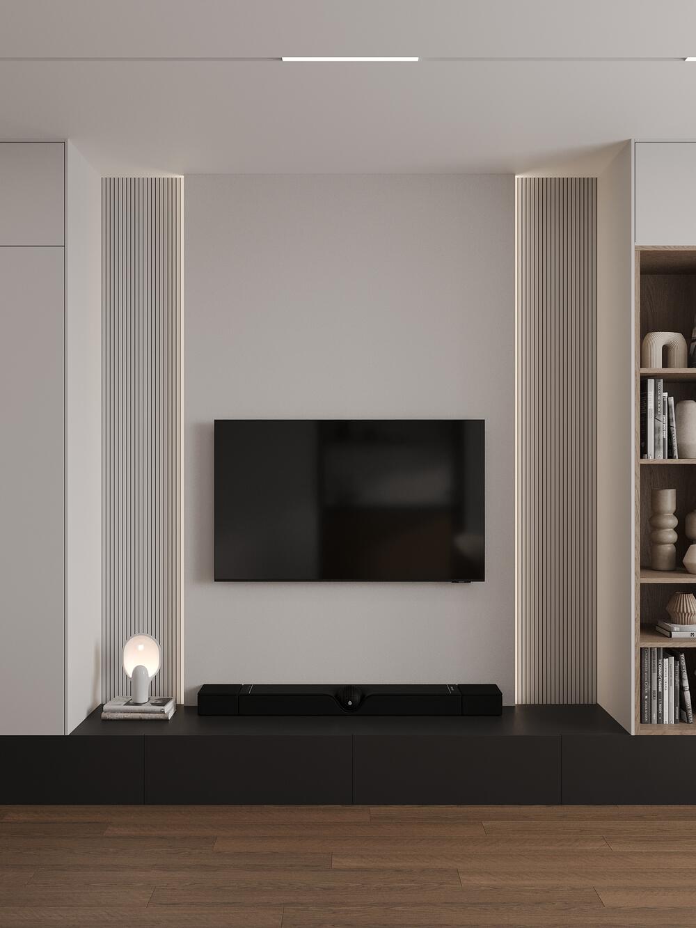ТВ-зона совмещена с хранением: шкафы выполнены в цвет стен, поэтому они не перегружают пространство. Деревянные вставки добавляют тепла и визуально «поднимают» потолки.