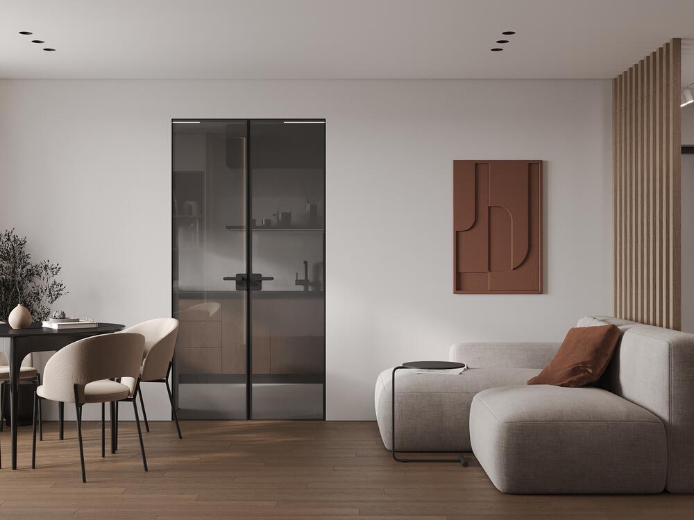 Между кухней и гостиной установили двери с графитовым стеклом — они легко закрывают пространство при необходимости и при этом пропускают свет.