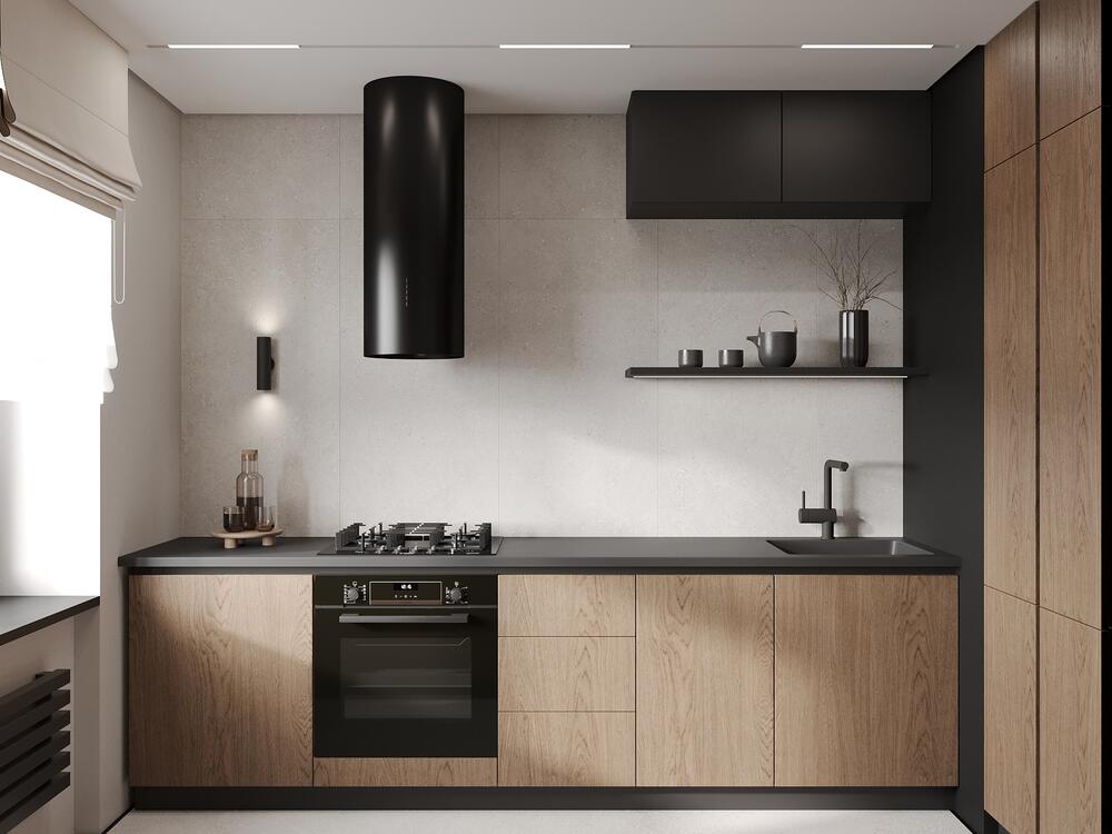 Главным акцентом стала выразительная текстура дерева в сочетании с чёрными деталями. Даже при небольшой площади удалось встроить всю технику, включая посудомоечную машину. Газовые трубы аккуратно спрятали в стене, сохранив к ним доступ.