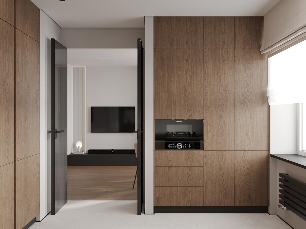 Интерьер выполнен в современном стиле с элементами минимализма. Основу интерьера составляет светло-серый теплого оттенка и кофейные цвета. Чёрные акценты добавляют графичности, а дерево с ярко выраженной текстурой вносит тепло и делает пространство более живым.