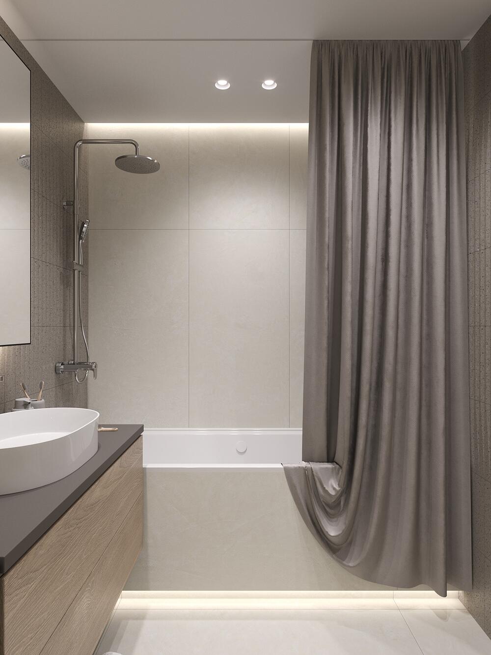 Отделка выдержана в светлой гамме с сочетанием гладких и фактурных поверхностей. Мягкая текстильная штора на скрытом карнизе заменяет перегородку и смотрится аккуратно. Подсветка под тумбой и за зеркалом добавляет мягкий свет и делает помещение визуально больше.