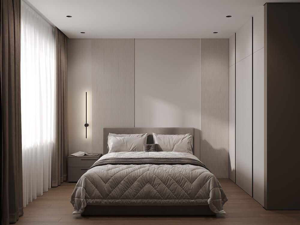 Для хранения сделали шкафы до потолка. Они выполнены в тех же спокойных оттенках, что и стены, и поэтому не бросаются в глаза, а смотрятся как часть интерьера. Светлые бежевые тона и аккуратные детали вроде встроенных светильников делают спальню тёплой и спокойной.