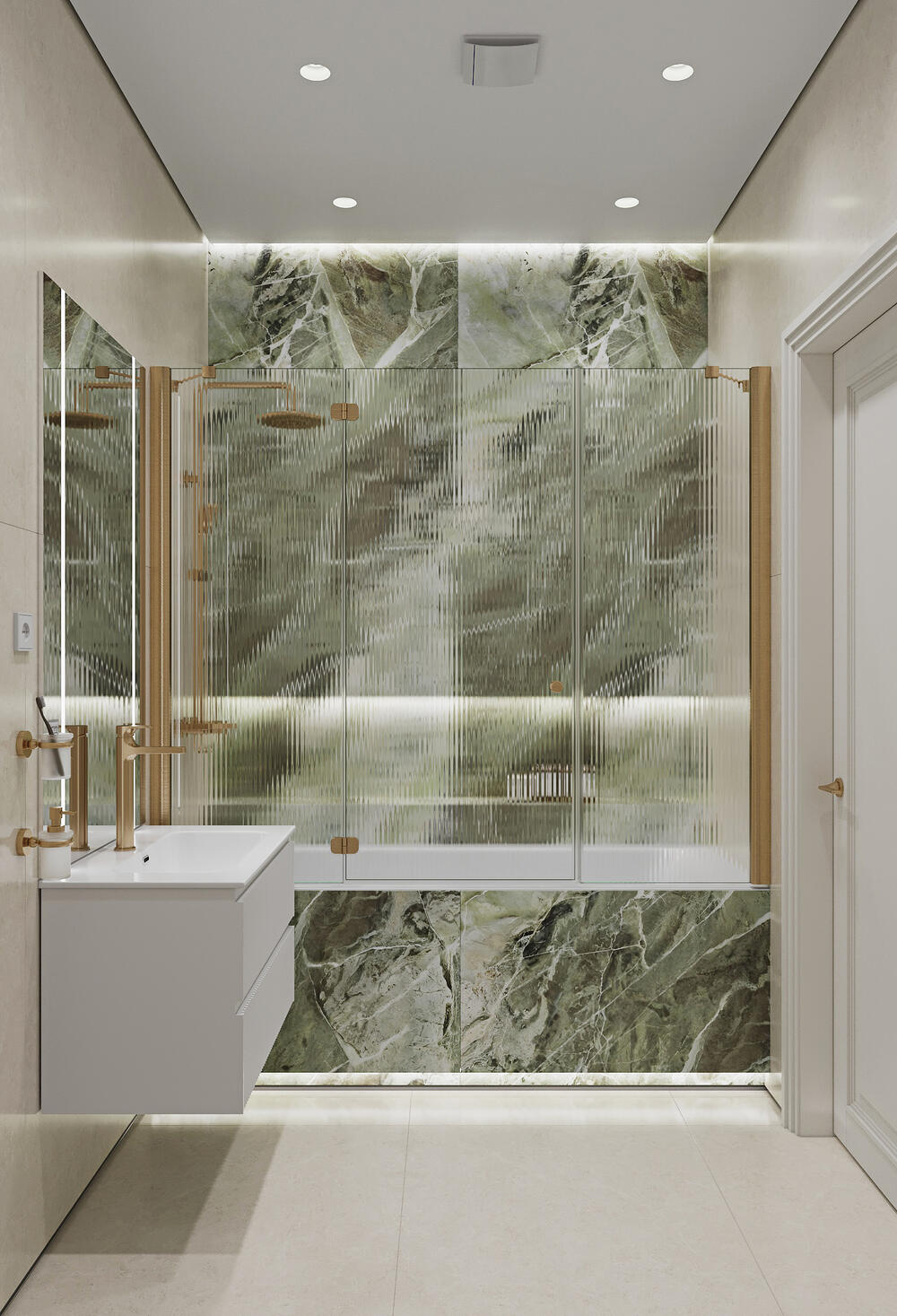 В отделке использован крупноформатный керамогранит светлого оттенка с минимальным количеством швов. Главным акцентом стала душевая зона, облицованная темным натуральным гранитом с активным природным рисунком. Золотистая сантехника и фурнитура добавляют интерьеру благородства и поддерживают общую концепцию неоклассики.