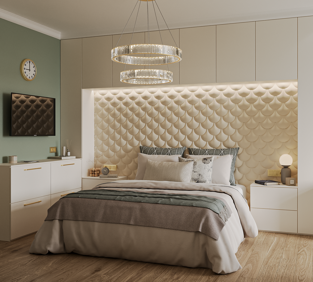 Спальная зона оформлена эффектным акцентным изголовьем с объемным узором в виде чешуек, которое мягко подсвечивается встроенной в мебельную конструкцию иллюминацией. Над кроватью парит хрустальная двухъярусная люстра, добавляя интерьеру нотку неоклассического блеска.