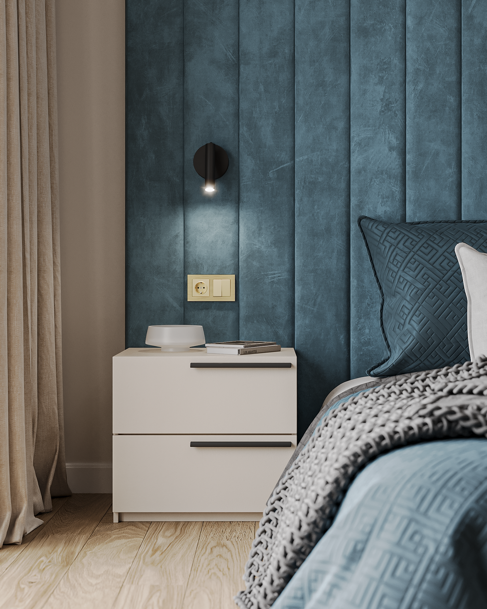 - Текстильные панели - использованы для оформления изголовий кроватей в спальнях. Мягкие фактуры в сочетании с продуманным светом создают атмосферу уюта и комфорта, необходимую для зон отдыха.