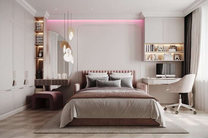 Детская создана для жизни подростка: учёбы, отдыха и встреч с друзьями. Кровать с мягким изголовьем, встроенный шкаф вместо лишней мебели и рабочее место у окна с полками для книг.