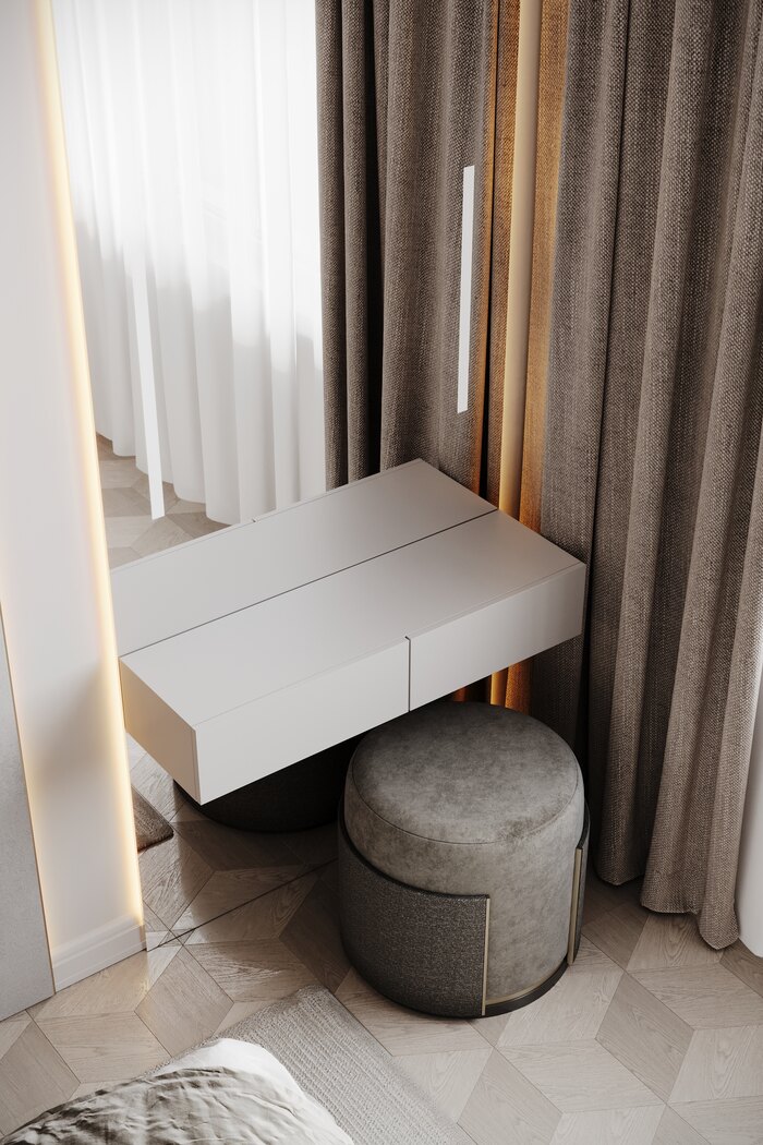 Напротив — телевизор, рядом вместительный шкаф, который заменил отдельную гардеробную. У окна разместили консоль с пуфами — её можно использовать как рабочий столик или как туалетный. Всё продумано так, чтобы в комнате хватало места для сна, хранения и повседневных дел.