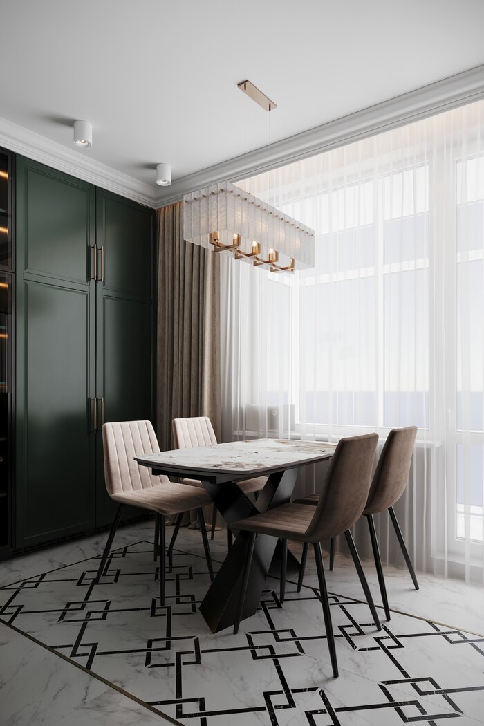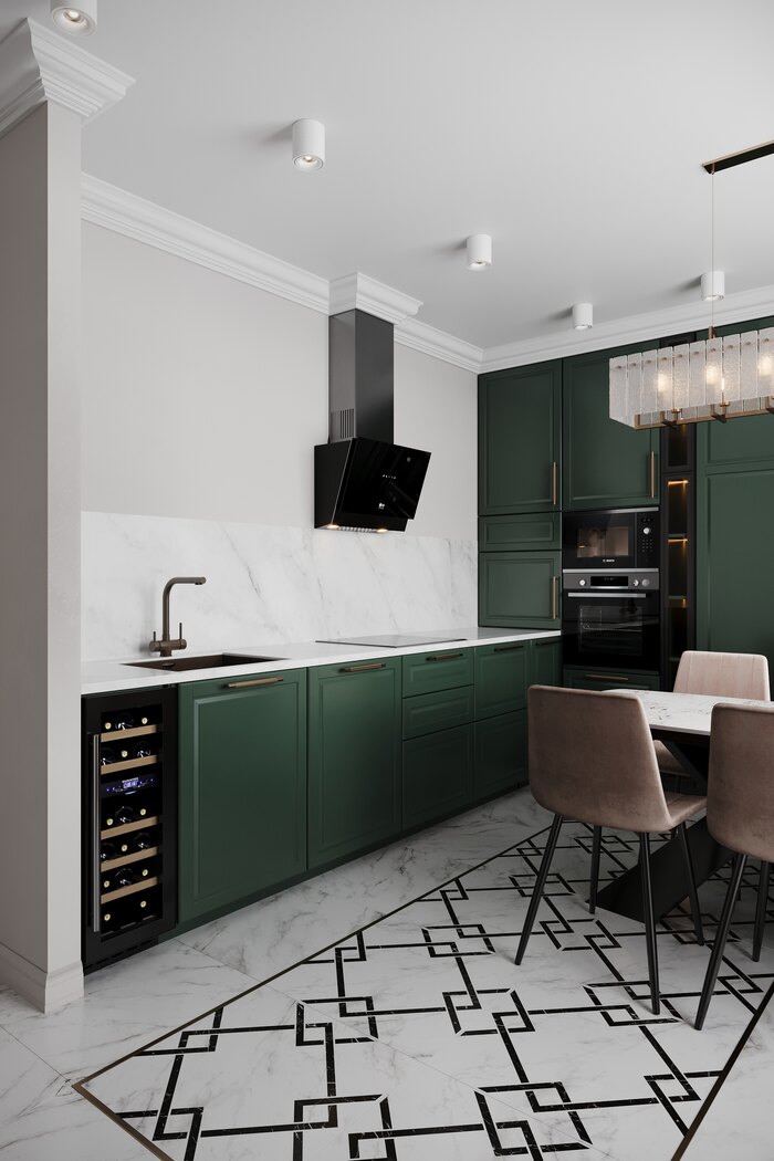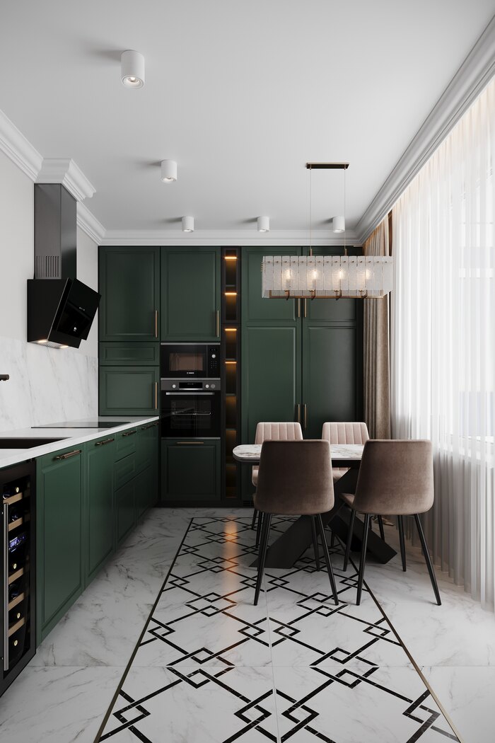 Главная просьба хозяев — лёгкость и простор. Мы отказались от верхних шкафов по одной из стен, и кухня сразу стала светлее и «воздушнее». Изумрудные фасады задали акцент — яркие, но при этом гармонично сочетаются с нейтральными стенами и светлым полом.