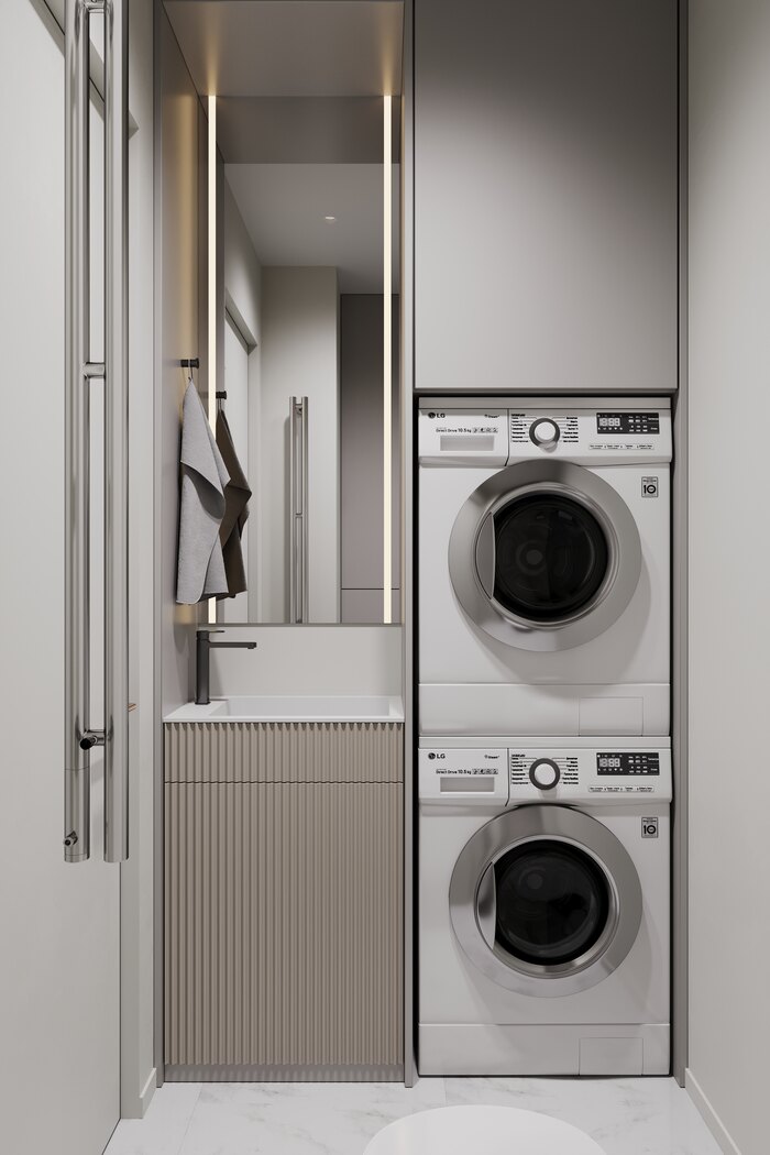 Есть компактная раковина с тумбой и закрытые шкафы для бытовой химии и белья. Теперь все процессы стирки вынесены в отдельную зону, и квартира остаётся свободнее и организованнее.
