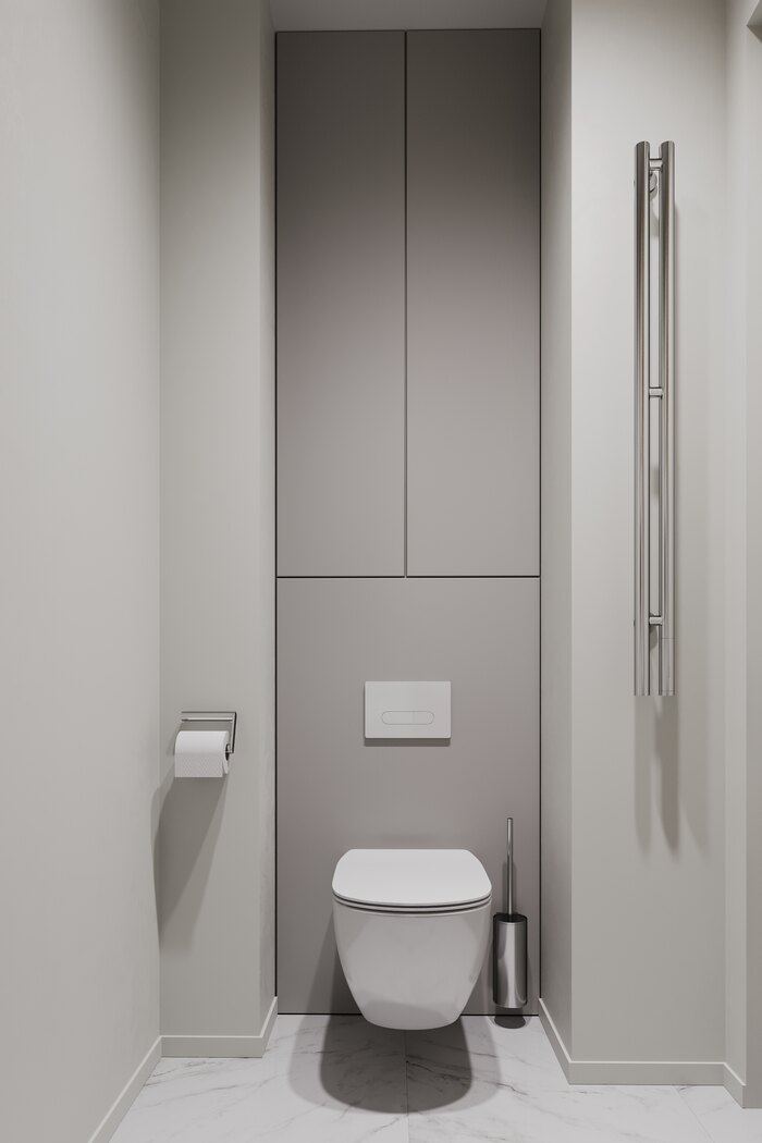Встроенные ниши заменили полки и помогли аккуратно разместить всё необходимое. Подвесная тумба с раковиной и шкафы над инсталляцией дают дополнительное хранение. Отделка керамогранитом с текстурой камня добавила интерьеру стиль и долговечность.