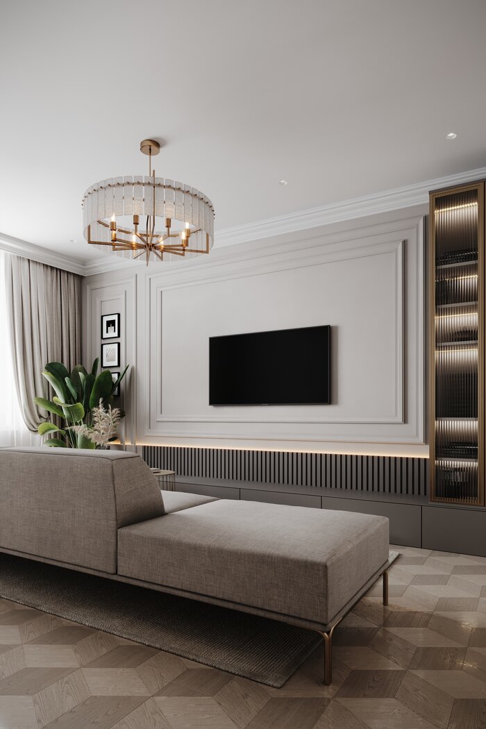 Гостиная — сердце квартиры. Здесь разместили мягкий диван и телевизор, стену оформили декоративными панелями в классическом стиле. Встроенные шкафы спрятали хранение, поэтому комната выглядит лёгкой и аккуратной.