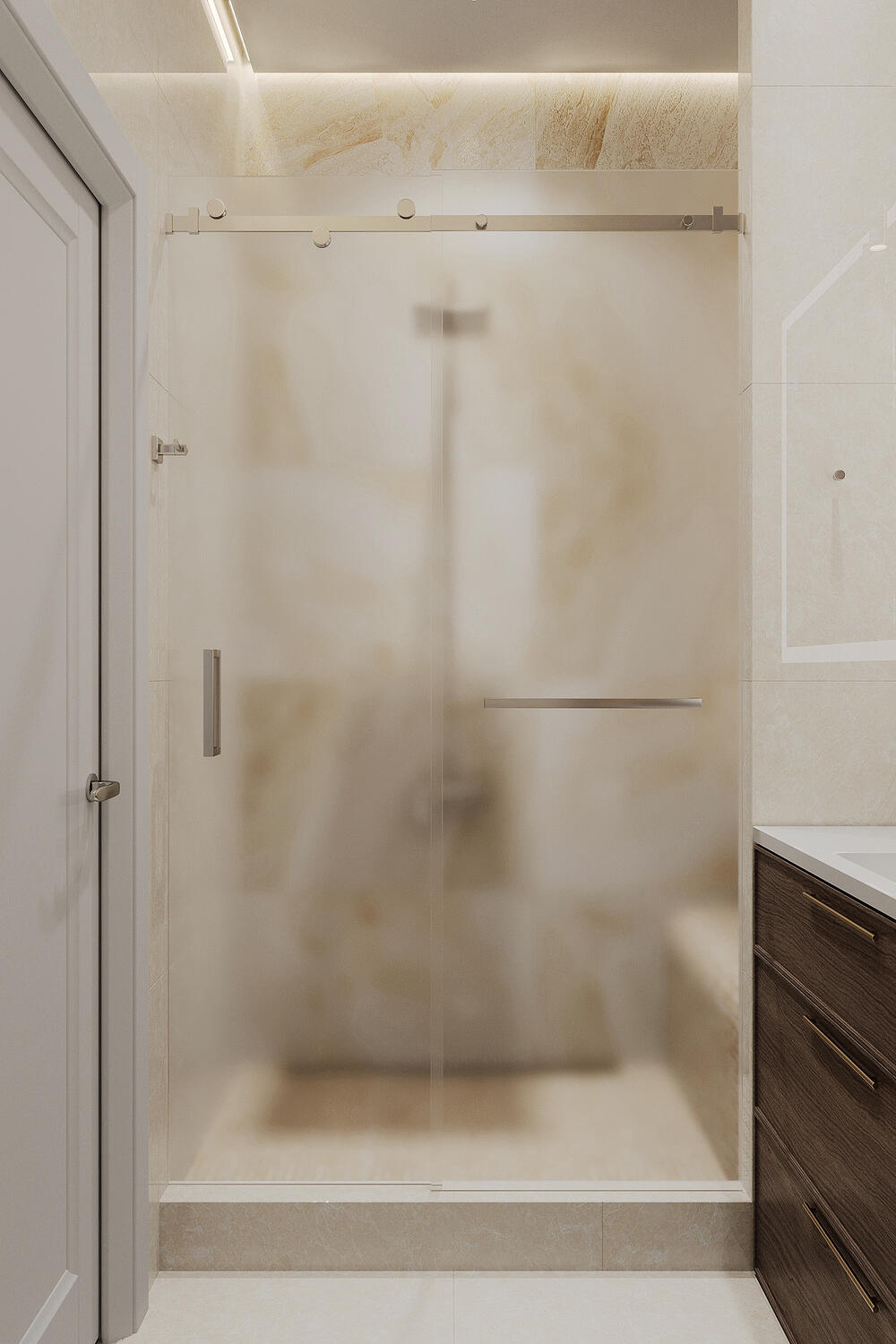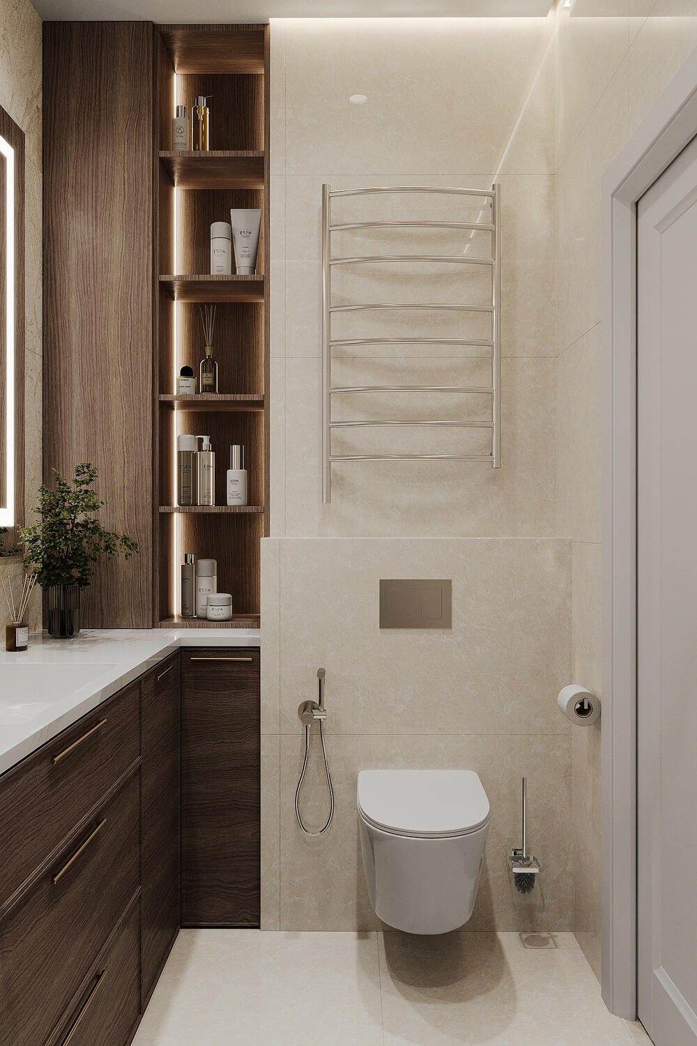 - В санузле при спальне комфортно расположить зону душа и блок коммуникаций