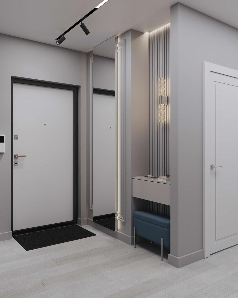 Основной акцент сделан на зону с зеркалом во весь рост, обрамлённым декоративной рамой и подсветкой. Рядом — консоль с выдвижным ящиком для хранения мелочей и мягкая банкетка насыщенного синего цвета. Встроенный гардероб скрыт за однотонными фасадами, что позволяет сохранить визуальную целостность пространства и убрать лишние детали с глаз. Потолочные трековые светильники создают направленный свет и выделяют функциональные зоны.
